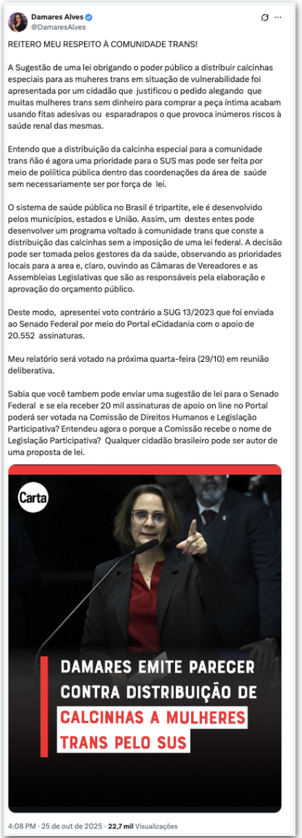 “A sugestão foi apresentada por um cidadão que justificou o pedido alegando que muitas mulheres trans sem dinheiro para comprar a peça íntima acabam usando fitas adesivas ou esparadrapos, o que provoca inúmeros riscos à saúde renal das mesmas”, escreveu no X. “Entendo que a distribuição da calcinha especial para a comunidade trans não é agora uma prioridade para o SUS, mas pode ser feita por meio de política pública dentro das coordenações da área de saúde sem necessariamente ser por força de lei”.