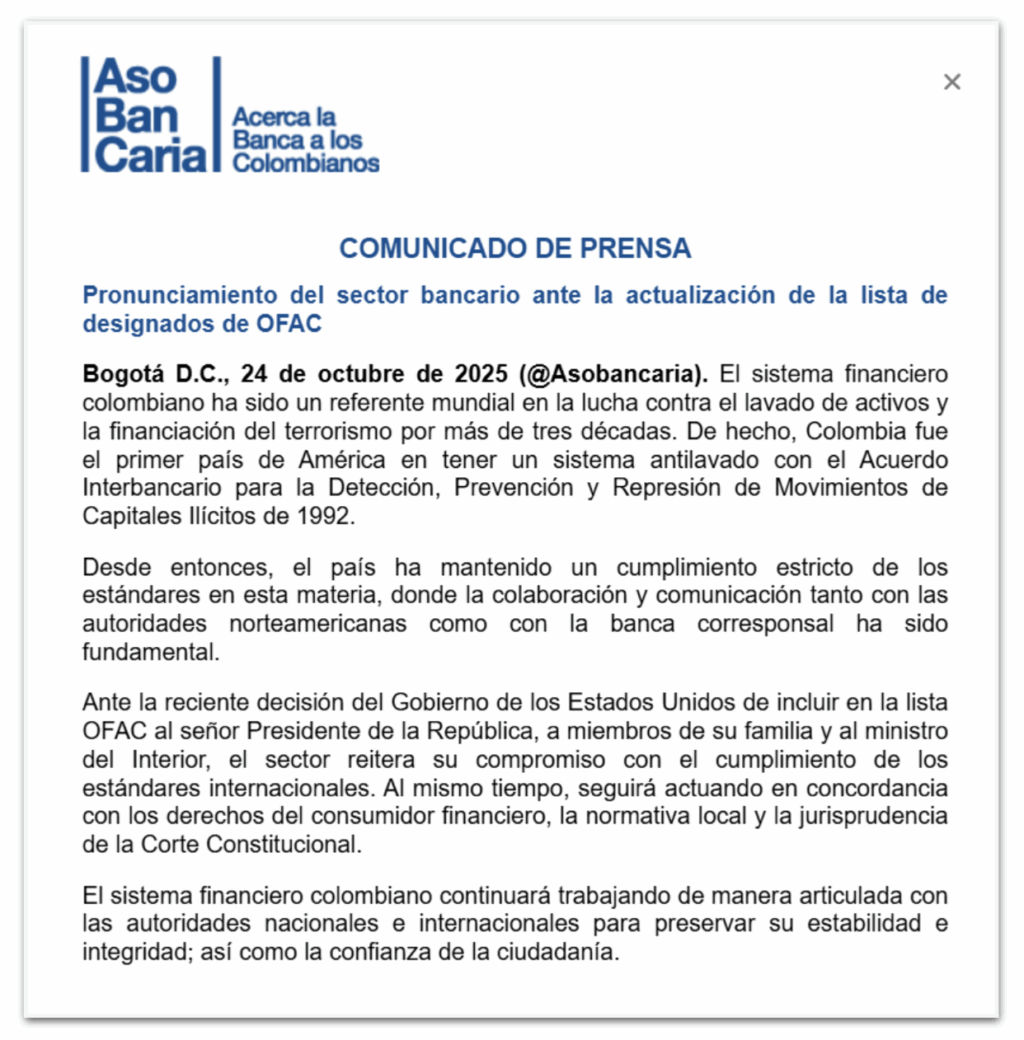 A Asobancaria (Associação Bancária da Colômbia) publicou um comunicado no mesmo dia em que os EUA sancionaram Petro. “O setor reitera seu compromisso com o cumprimento das normas internacionais”, escreveu. “Ao mesmo tempo, continuará agindo de acordo com os direitos do consumidor financeiro, a regulamentação local e a jurisprudência da Corte Constitucional”.