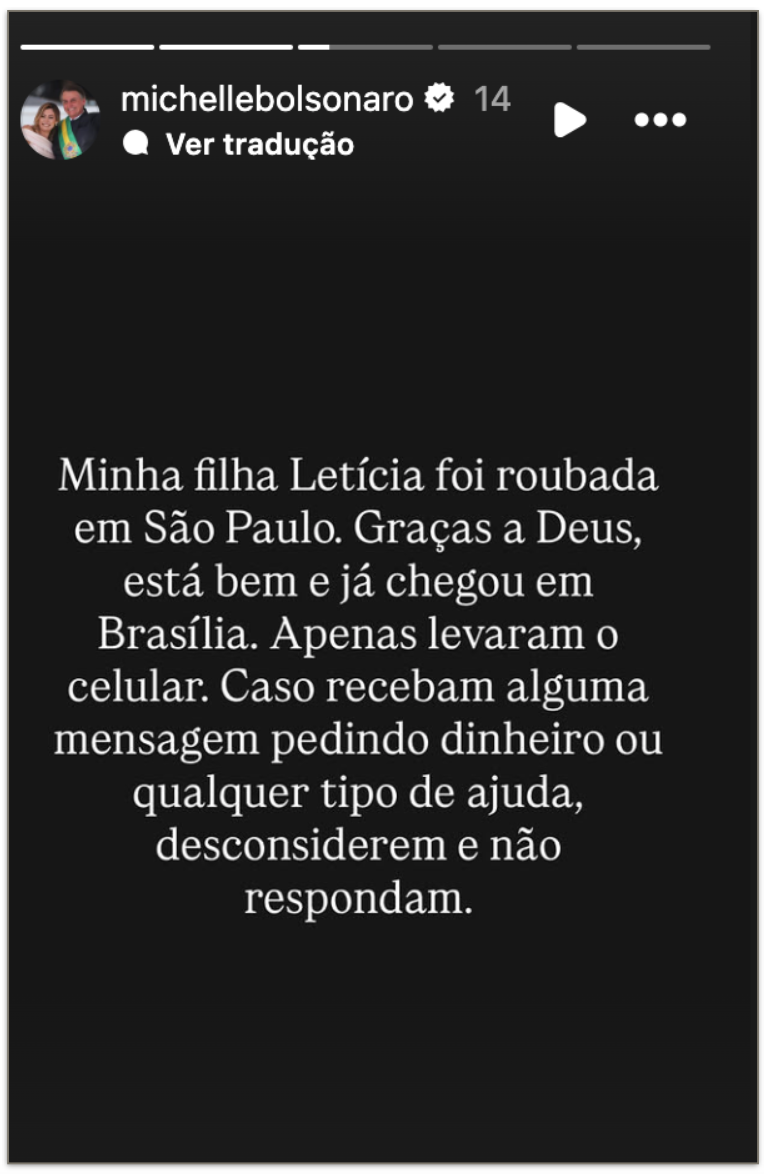 De acordo com a ex-primeira-dama, Letícia não sofreu ferimentos, mas teve o celular levado pelos assaltantes. Michelle não citou o local exato do crime nem mencionou se foi feito um boletim de ocorrência. Depois do assalto, a jovem de 23 anos retornou a Brasília e está em segurança.