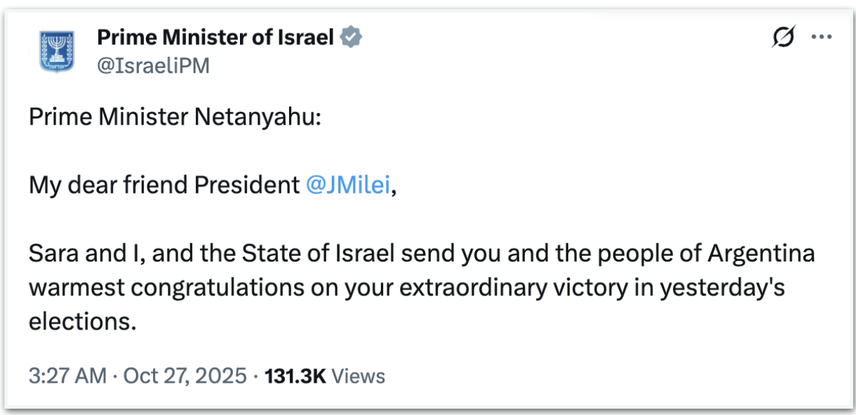 O primeiro-ministro de Israel, Benjamin Netanyahu (Likud, direita), também deu os parabéns a Milei: “Meu caro amigo presidente, Sara e eu, e o Estado de Israel enviamos a você e ao povo da Argentina os mais calorosos parabéns pela sua extraordinária vitória nas eleições de ontem”.