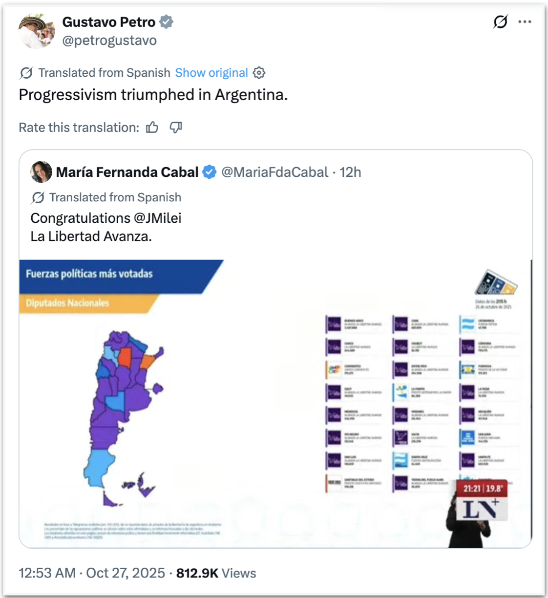 O presidente da Colômbia, Gustavo Petro (Colômbia Humana, esquerda), deu os parabéns a Milei e disse que o “progressismo triunfou” na Argentina.
