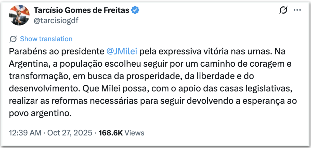 O governador de São Paulo, Tarcísio de Freitas (Republicanos), disse que na Argentina, “a população escolheu seguir por um caminho de coragem e transformação, em busca da prosperidade, da liberdade e do desenvolvimento”.