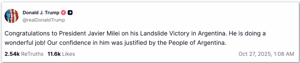 O presidente dos Estados Unidos, Donald Trump (Partido Republicano), escreveu em seu perfil na Truth Social: “Parabéns ao presidente Milei pela sua vitória esmagadora na Argentina. Ele está fazendo um trabalho maravilhoso! Nossa confiança nele foi justificada pelo povo argentino”.