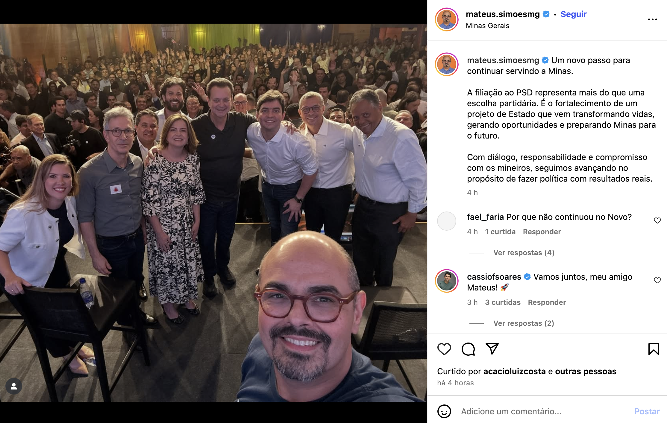 No Instagram, Mateus escreveu que a filiação é “um novo passo para continuar servindo a Minas”.