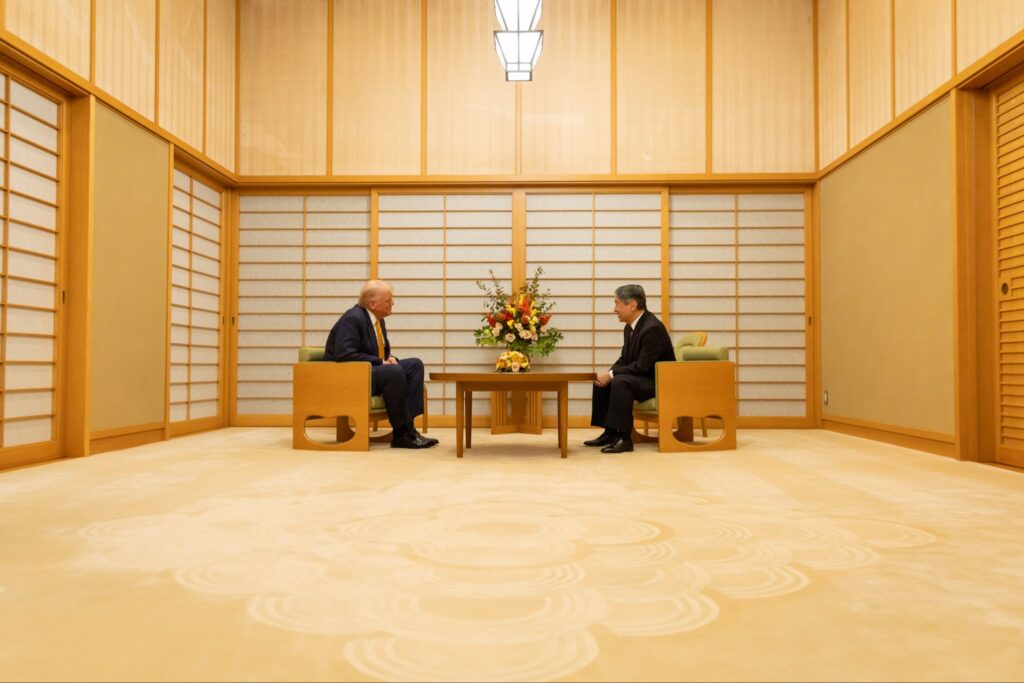 Trump se encontrou com o imperador do Japão, Naruhito, no Palácio Imperial. Antes disso, o republicano sobrevoou a capital japonesa em seu helicóptero. Diversas torres da cidade foram iluminadas com as cores da bandeira norte-americana: azul, vermelho e branco.