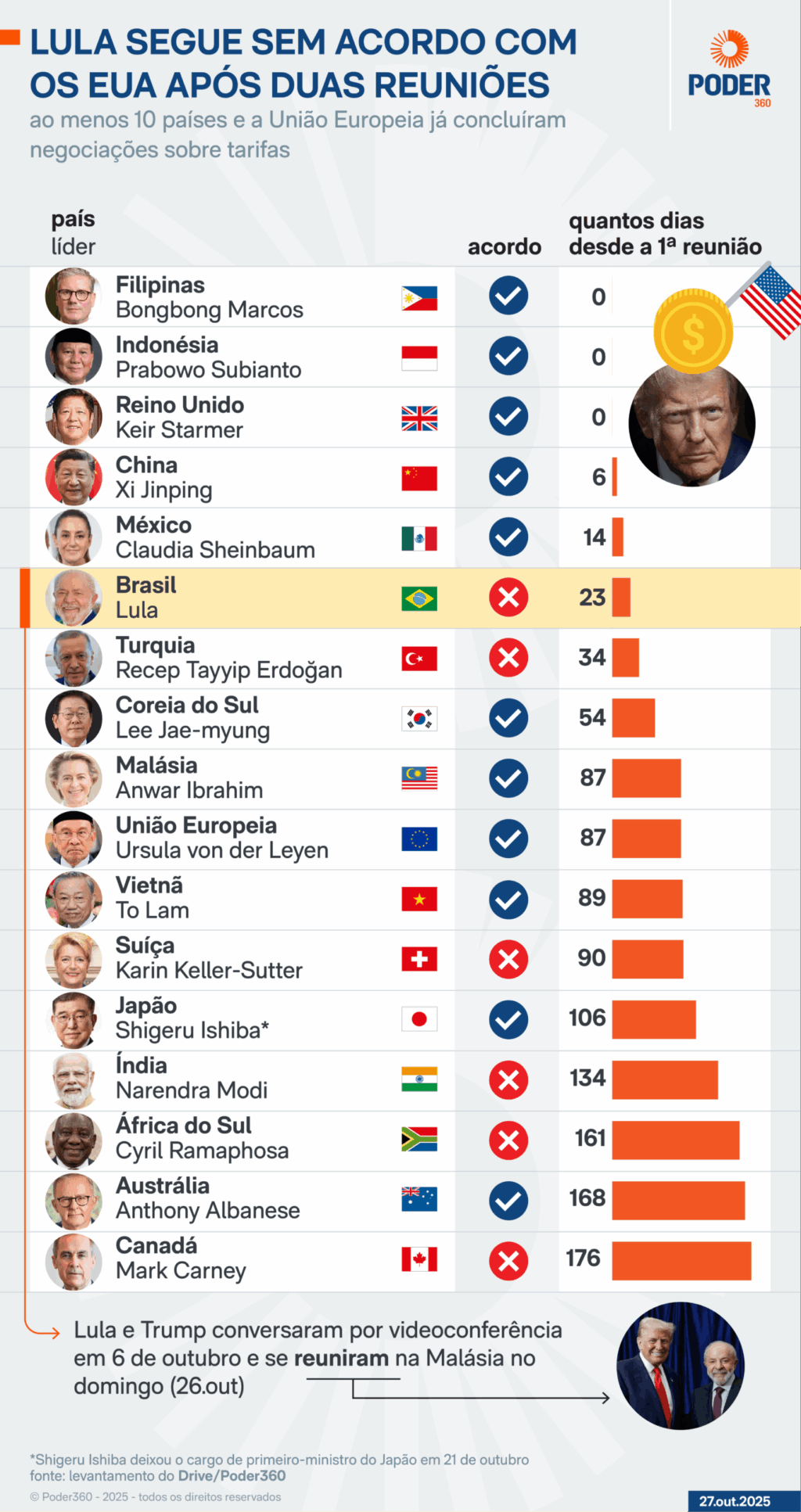 Com isso, já se vão 23 dias sem progresso desde o início das conversas de alto nível entre Brasil e EUA, o que coloca o Brasil atrás de 5 países que foram mais eficientes nas negociações com o líder norte-americano.