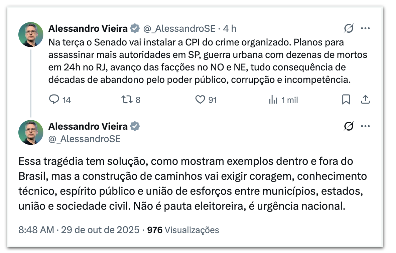 “Planos para assassinar mais autoridades em SP, guerra urbana com dezenas de mortos em 24h no RJ, avanço das facções no NO [Norte] e NE [Nordeste], tudo consequência de décadas de abandono pelo poder público, corrupção e incompetência”, escreveu Vieira em publicação no X (ex-Twitter).