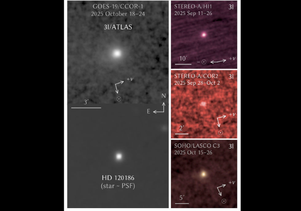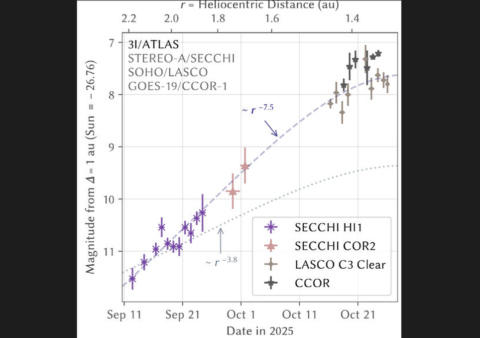 Eles descobriram que o brilho do cometa 3I/ATLAS aumentou exponencialmente em relação à sua distância decrescente do Sol, duas vezes mais rápido do que no início do ano. Em seu artigo, eles especularam que isso poderia ser devido a um aumento repentino na sublimação da água do núcleo do cometa.