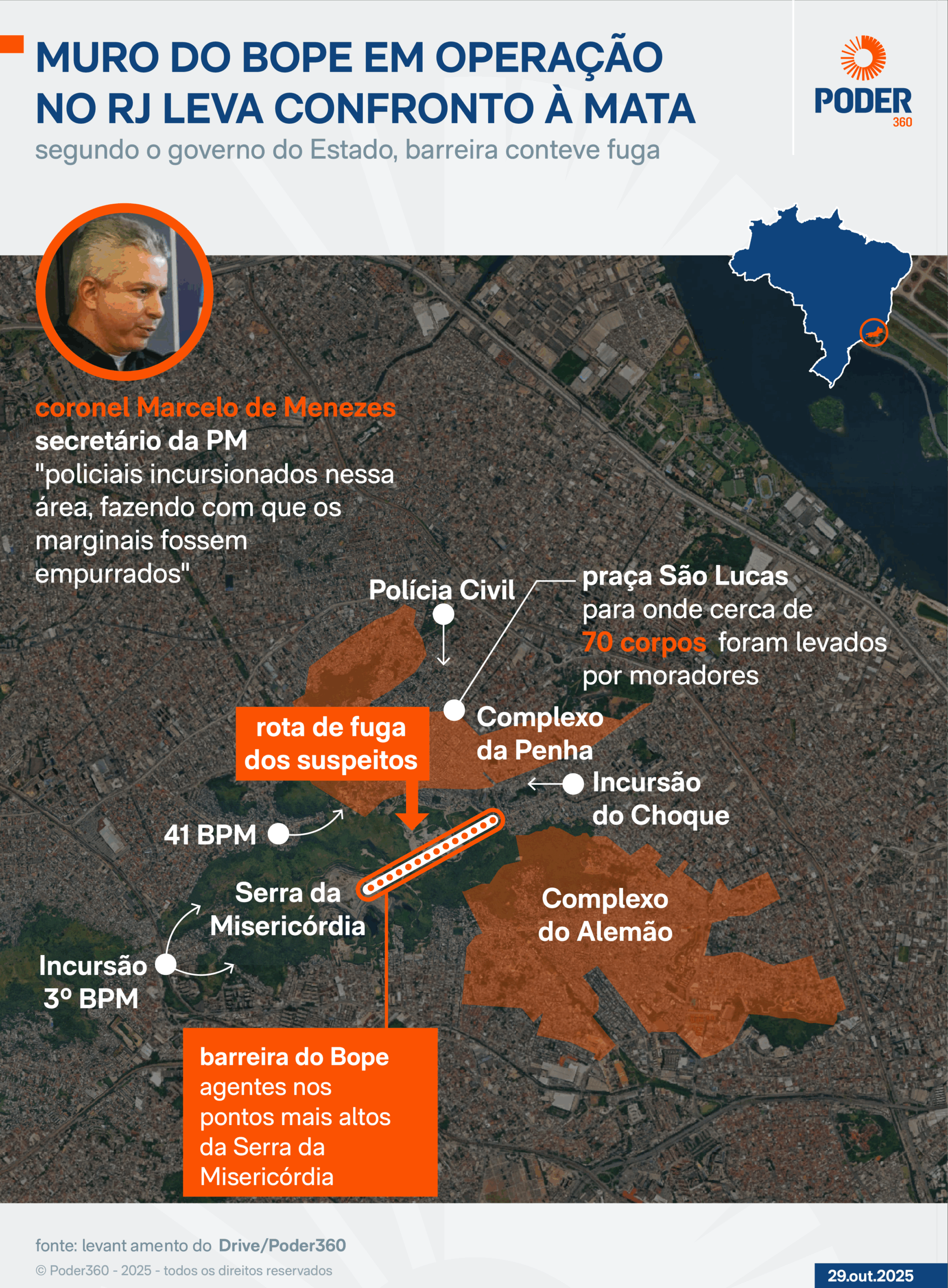 “O objetivo era proteger a população e garantir a integridade física dos moradores do Alemão e da Penha. A maioria dos confrontos, ou praticamente todos, ocorreu na área de mata”, declarou Menezes a jornalistas na 4ª feira (29.out).