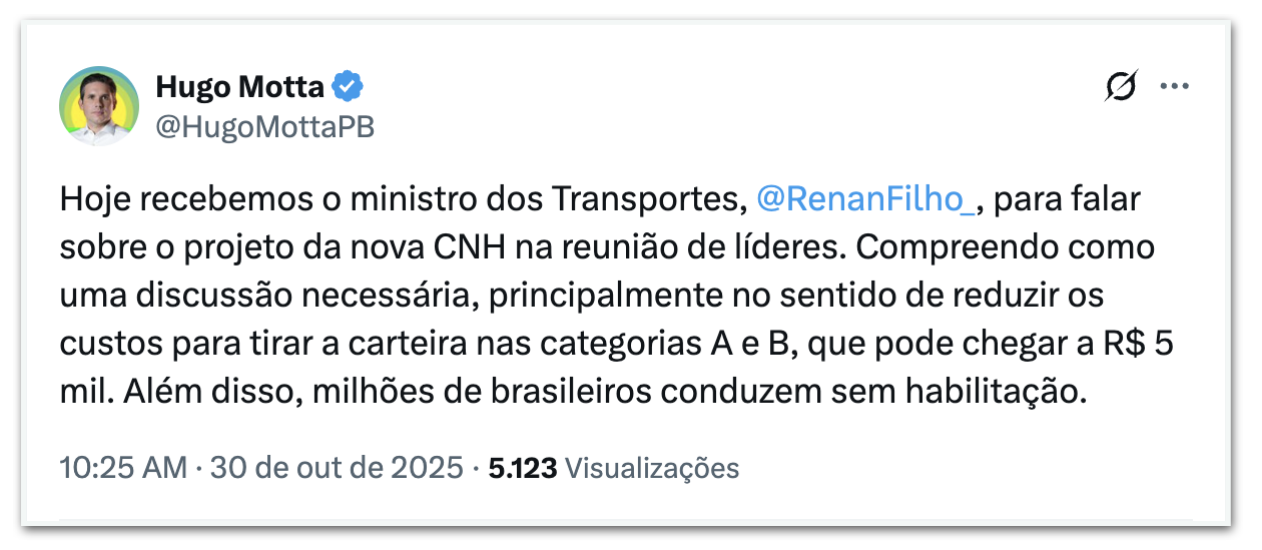 “Compreendo como uma discussão necessária, principalmente no sentido de reduzir os custos para tirar a carteira nas categorias A e B, que pode chegar a R$ 5 mil. Além disso, milhões de brasileiros conduzem sem habilitação”, escreveu o presidente da Câmara em seu perfil no X (ex-Twitter) depois da reunião.