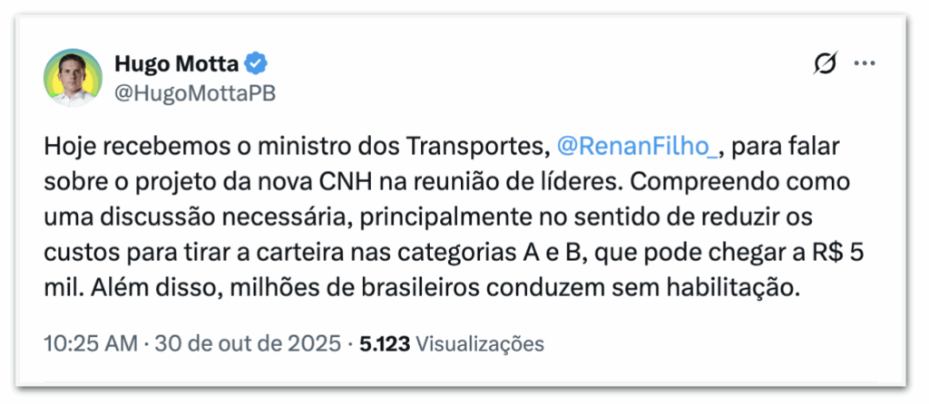 “Compreendo como uma discussão necessária, principalmente no sentido de reduzir os custos para tirar a carteira nas categorias A e B, que pode chegar a R$ 5 mil. Além disso, milhões de brasileiros conduzem sem habilitação”, escreveu o presidente da Câmara em seu perfil no X (ex-Twitter) depois da reunião.
