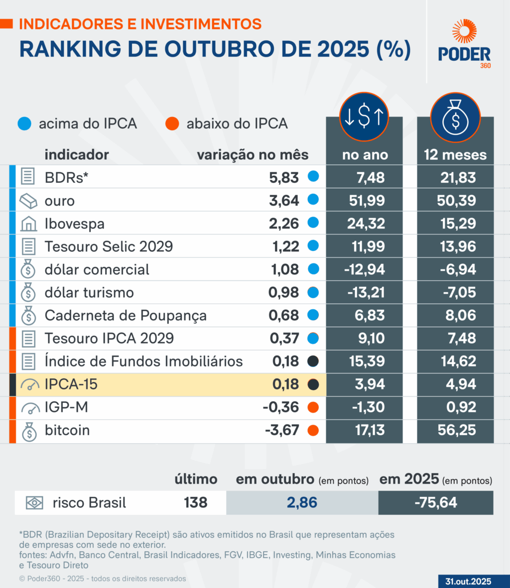 Esses investimentos foram alguns dos que ficaram acima da prévia da inflação, medida pelo IPCA-15 (Índice Nacional de Preços ao Consumidor Amplo 15), que atingiu 0,18% em outubro. Em 12 meses, a taxa é de 4,94%.