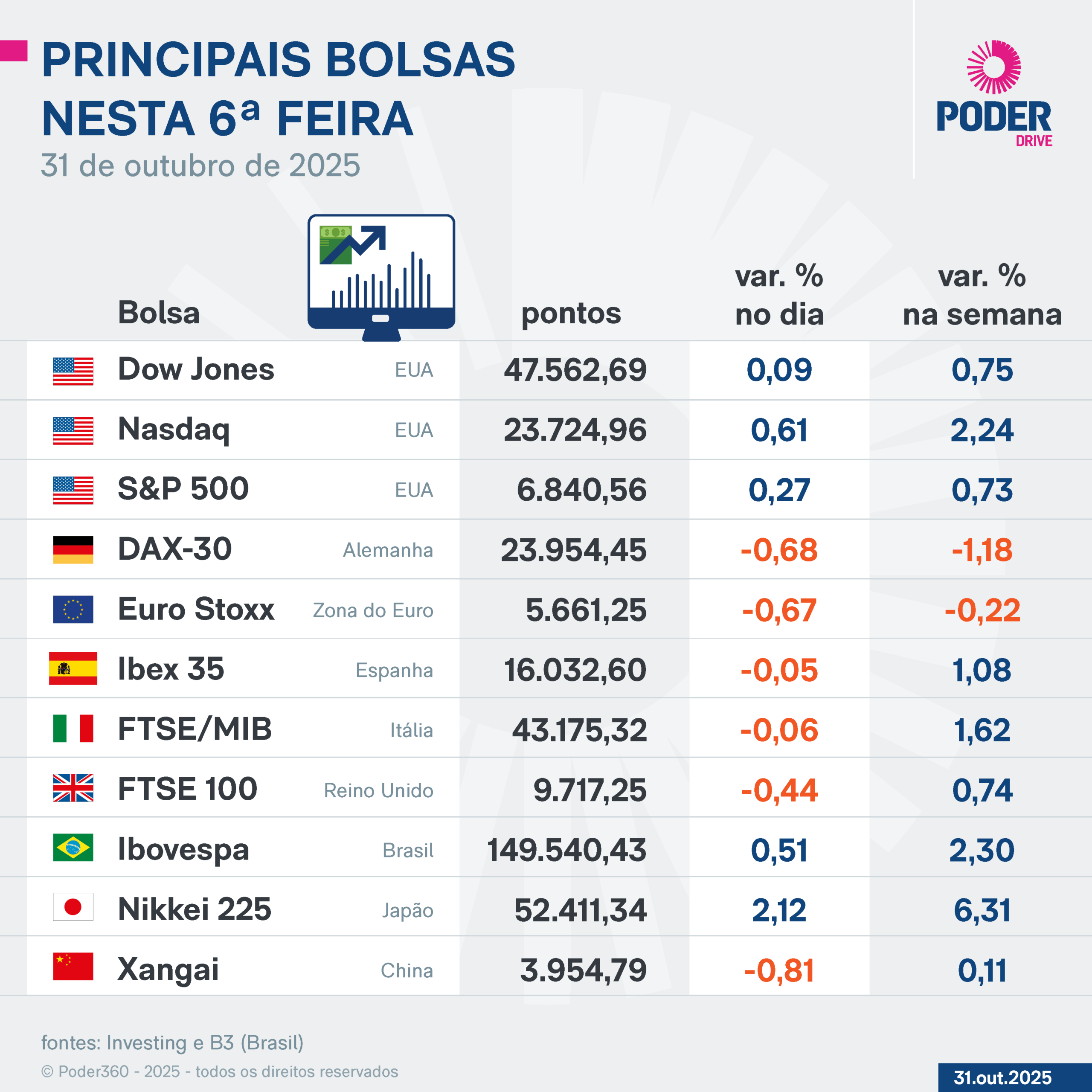 O Ibovespa, principal índice da B3 (Bolsa de Valores de São Paulo), fechou aos 149.540 pontos nesta 6ª feira (31.out.2025), com alta de 0,51%. Subiu pelo 8º dia consecutivo, período que acumulou alta de 3,79%. Na semana, avançou 2,30%. O dólar comercial foi para R$ 5,380, com queda de 0,01%. Na semana, a moeda norte-americana recuou 0,22%.