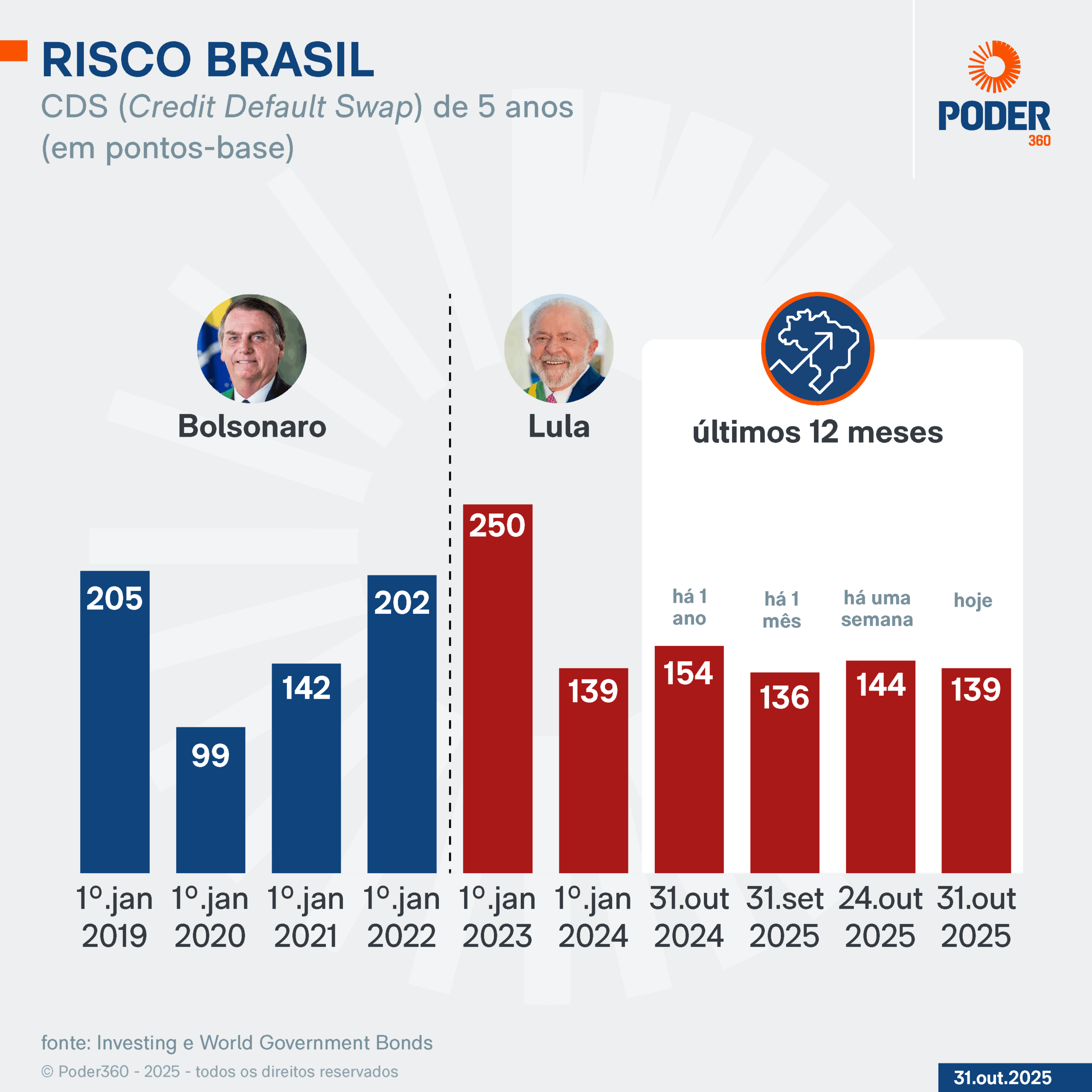 Usado para medir a confiança na economia, o CDS (Credit Default Swap) de 5 anos, o risco-país registrou 139 pontos nesta 6ª feira (31.out). Há 1 ano (31.out.2024), registrava 154.