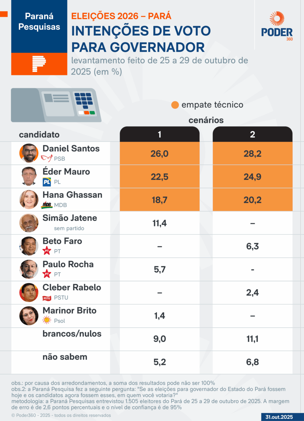 Levantamento divulgado pela Paraná Pesquisas nesta 6ª feira (31.out.2025) mostra um quadro acirrado para a eleição ao governo do Pará em 2026. Dr. Daniel (PSB), prefeito de Ananindeua, na região metropolitana de Belém, tem 26% das intenções de voto, contra 22,5% do deputado federal Delegado Éder Mauro (PL). Considerando a margem de erro do levantamento, de 2,6 pontos percentuais, ambos estão tecnicamente empatados.