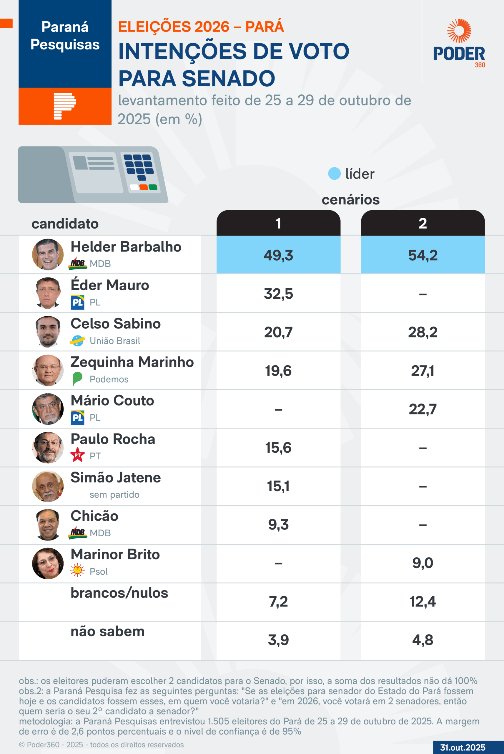Além de Barbalho e Mauro, o 1º cenário tem os seguintes candidatos: Celso Sabino (União Brasil); Zequinha Marinho (Podemos); Paulo Rocha (PT); Simão Jatene (sem partido) e Chicão (MDB).