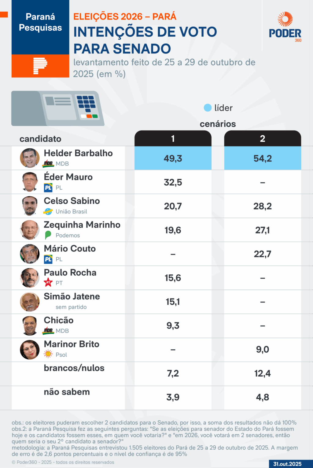 A pesquisa ouviu 1.505 eleitores em 61 municípios do Pará de 25 a 29 de outubro de 2025. O intervalo de confiança é de 95%. A margem de erro aproximada é de 2,6 pontos percentuais. As eleições serão realizadas em outubro de 2026.