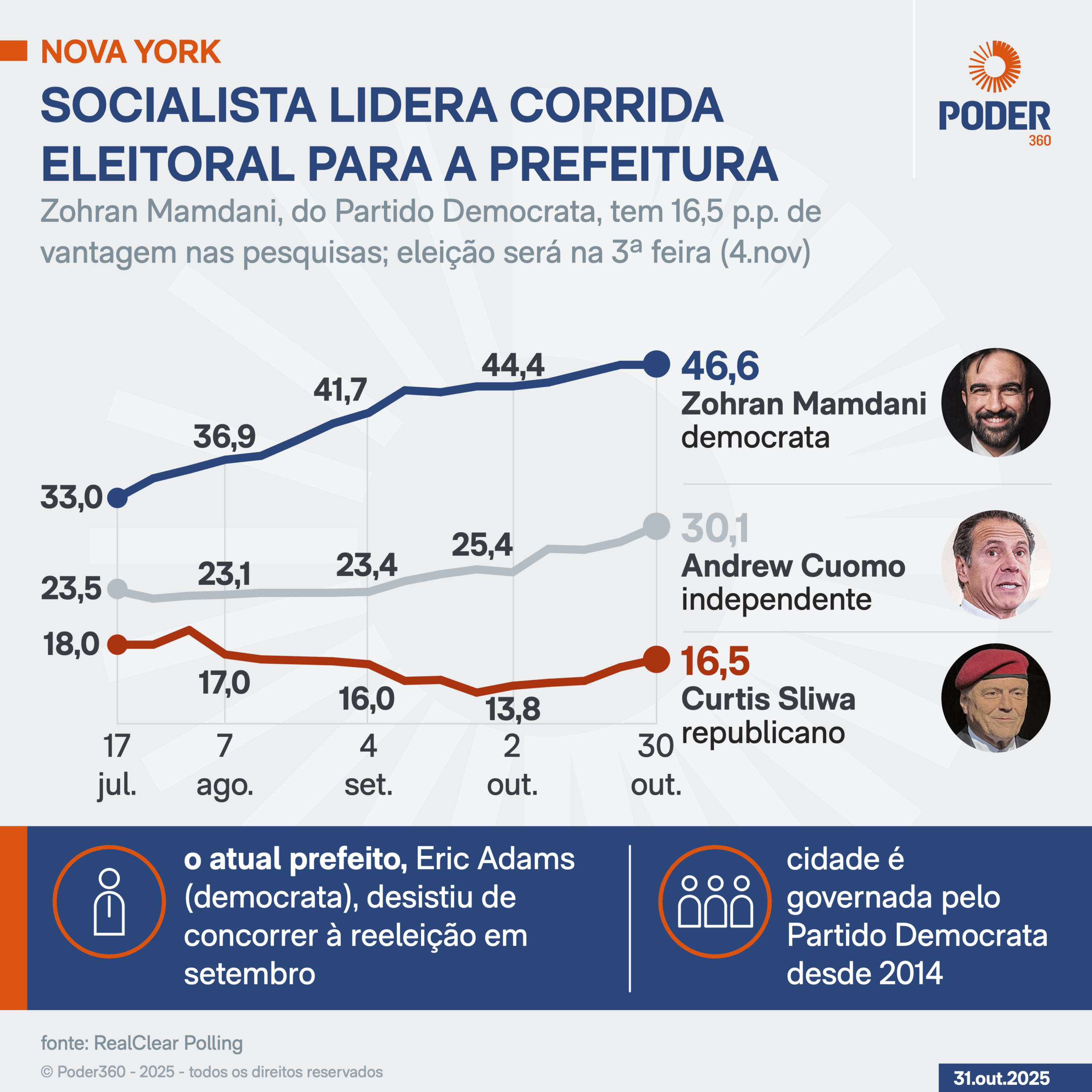 Zohran Mamdani emergiu como favorito à prefeitura depois de vencer as primárias do Partido Democrata em 24 de junho –a sigla governa a metrópole norte-americana desde 2014. O socialista quase sempre manteve uma distância de 10 p.p. sobre Cuomo nas pesquisas e chegou a abrir 19 pontos de frente. Contudo, viu sua vantagem oscilar 1,6 p.p. para baixo na última semana.
