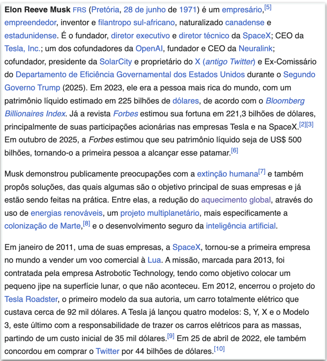 Musk anunciou publicamente que a nova plataforma é “uma melhoria massiva em relação à Wikipedia”. Segundo ele, o site tradicional é “controlado por ativistas de extrema-esquerda” e adota uma agenda “woke”. E que a Grokipedia, por sua vez, opera com artigos produzidos e verificados por um modelo de IA (“Grok”), e não permite edição aberta por voluntários, como acontece na Wikipedia.