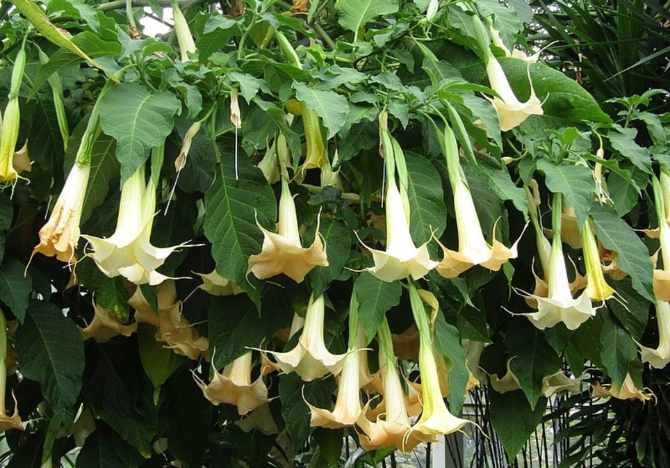 A flor-trombeta (Brugmansia suaveolens), também conhecida como trombeta-dos-anjos, é uma planta arbustiva que produz flores pendentes e perfumadas com formato semelhante à de uma trombeta.