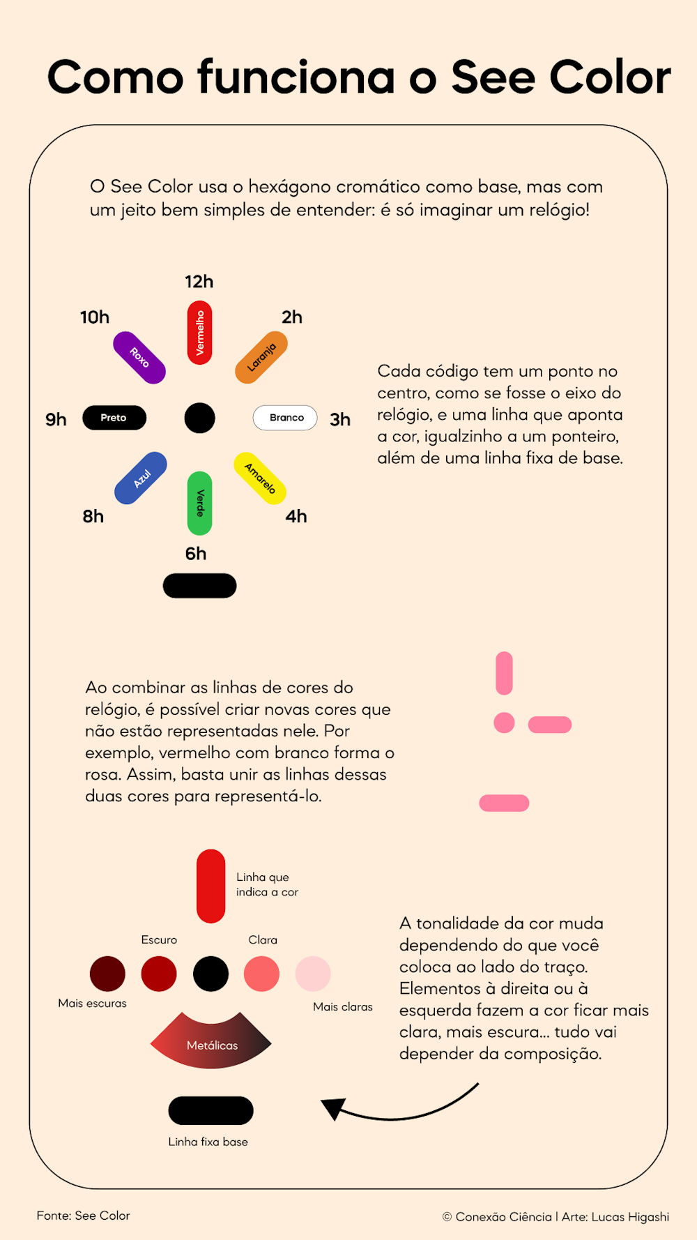 Por exemplo, a posição das “10 horas” representa o roxo; “6 horas”, o verde; “12 horas”, o vermelho. São 8 posições ao todo. Além disso, pontos adicionais ao lado do eixo indicam tonalidades claras ou escuras, e um semicírculo ao redor do código representa cores metálicas. Com essas variações, quase 100 cores diferentes podem ser identificadas só com o tato.