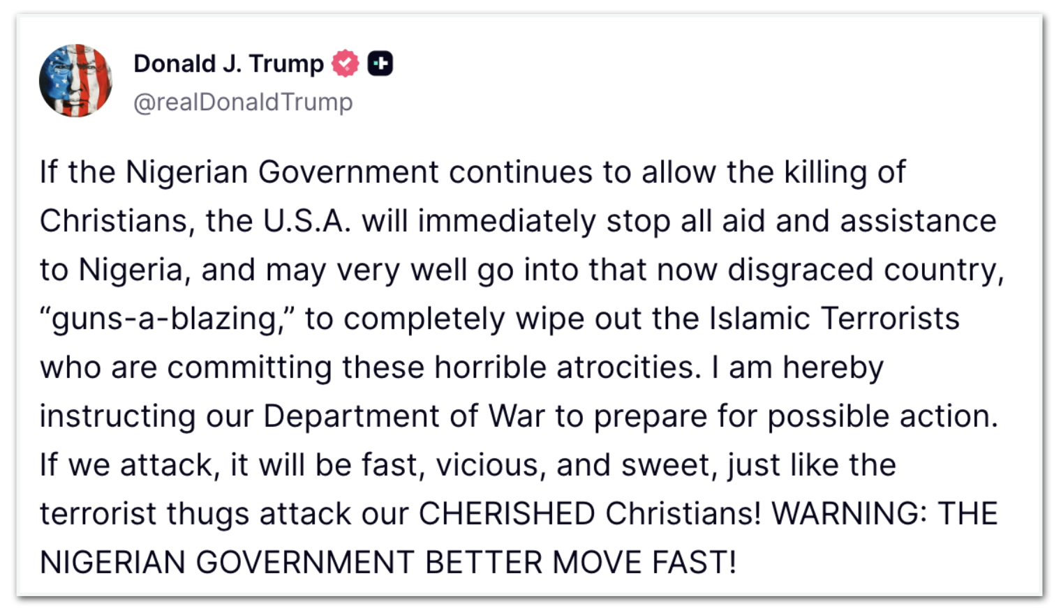 “Se o governo nigeriano continuar permitindo o assassinato de cristãos, os EUA suspenderão imediatamente toda a ajuda e assistência à Nigéria e poderão muito bem invadir esse país agora desonrado, “com armas em punho”, para aniquilar completamente os terroristas islâmicos que estão cometendo essas atrocidades horríveis. Estou instruindo nosso Departamento de Guerra a se preparar para uma possível ação. Se atacarmos, será rápido, brutal e certeiro, assim como os terroristas atacam nossos queridos cristãos”, escreveu Trump em seu perfil no Truth Social.