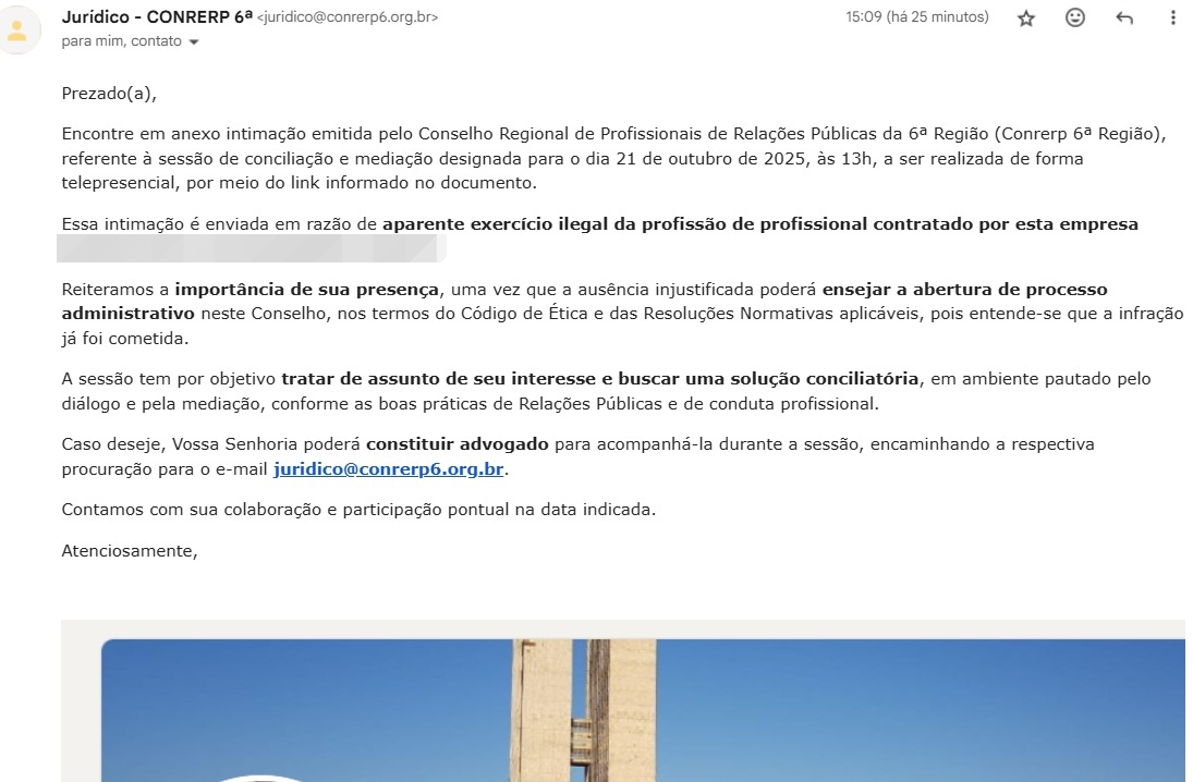 Intimação do Conrerp6 (Conselho Regional de Relações Públicas da 6ª região) a lobista de Brasília