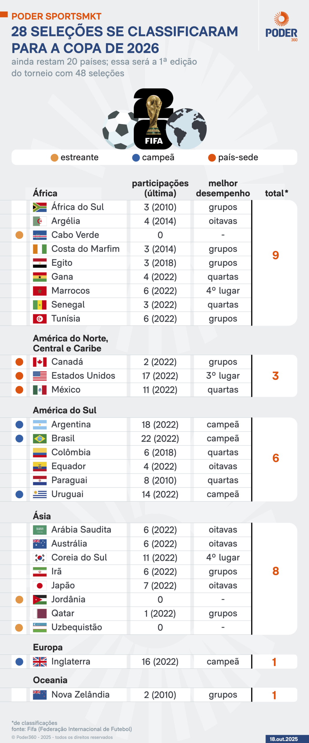 A Copa do Mundo de 2026 terá duas novidades. Será a 1ª edição organizada em 3 países-sede: Estados Unidos, Canadá e México. E a 1ª com o formato ampliado de 48 seleções, 16 a mais em relação aos últimos 7 torneios da Fifa. Até este domingo (2.nov), 28 seleções já se classificaram para a Copa. Restam 20.