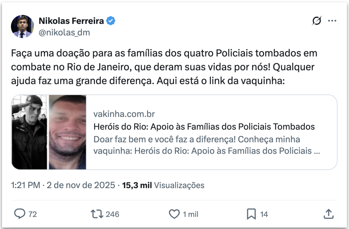 Em publicação no X, Nikolas compartilhou um site no qual está sendo feita uma vaquinha para as famílias. “Faça uma doação para as famílias dos quatro policiais tombados em combate no Rio de Janeiro, que deram suas vidas por nós! Qualquer ajuda faz uma grande diferença“, escreveu.