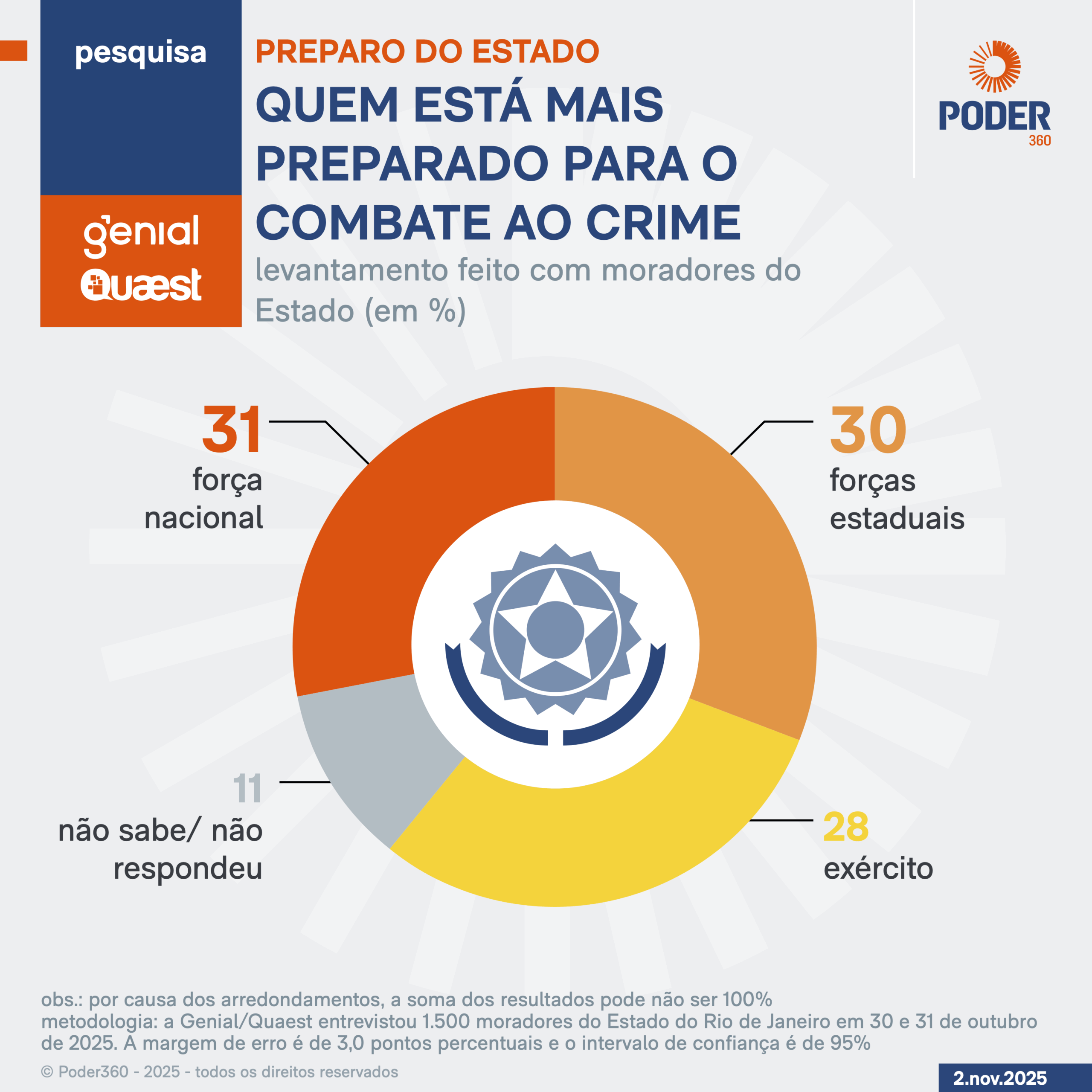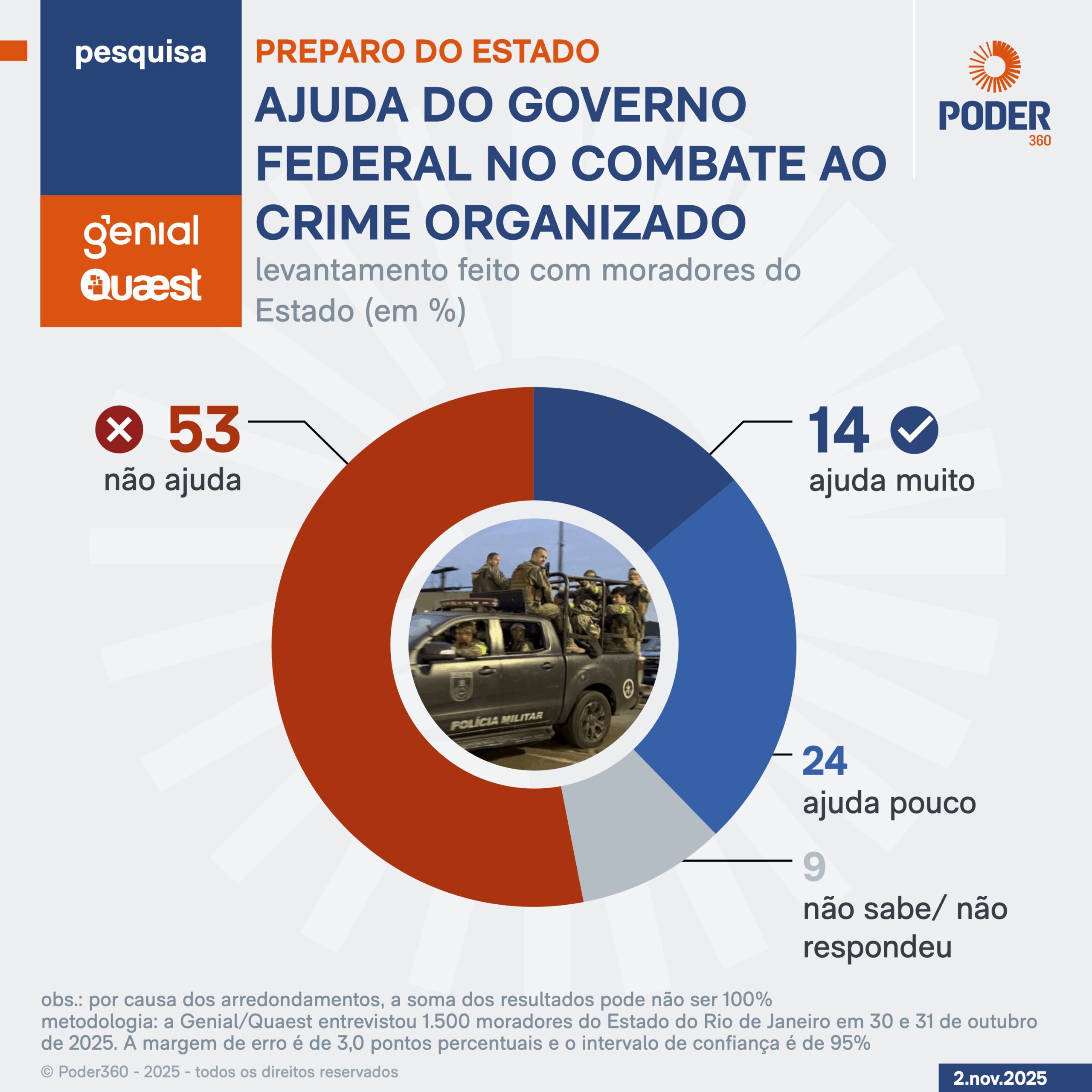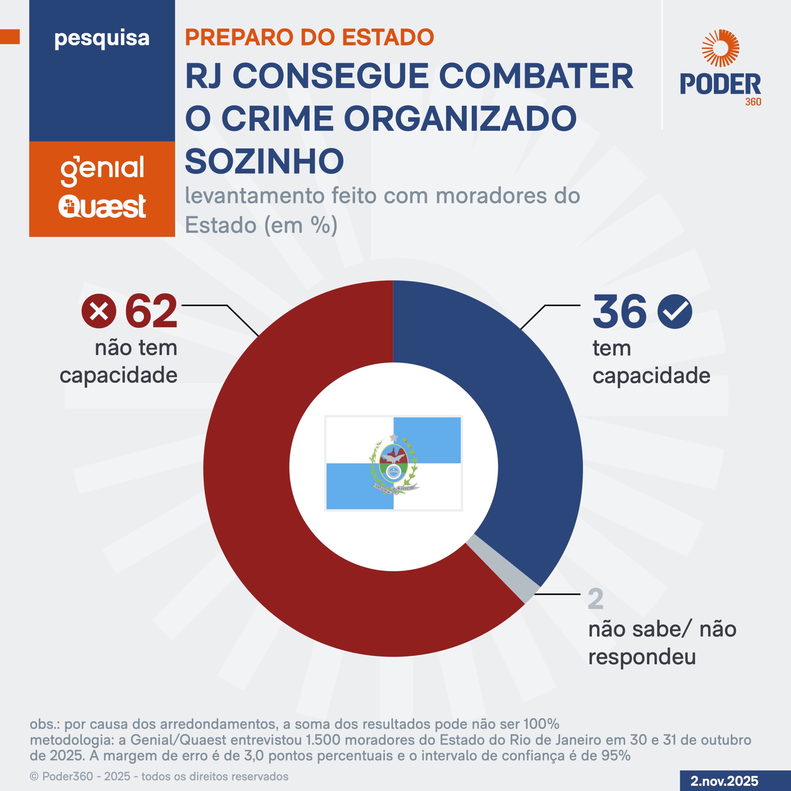 A pesquisa foi feita nos dias 30 e 31 de outubro. A Genial/Quaest entrevistou 1.500 moradores do Rio de Janeiro. A margem de erro é de 3 pontos percentuais e o intervalo de confiança é de 95%. Eis a íntegra (PDF – 13,6 MB).