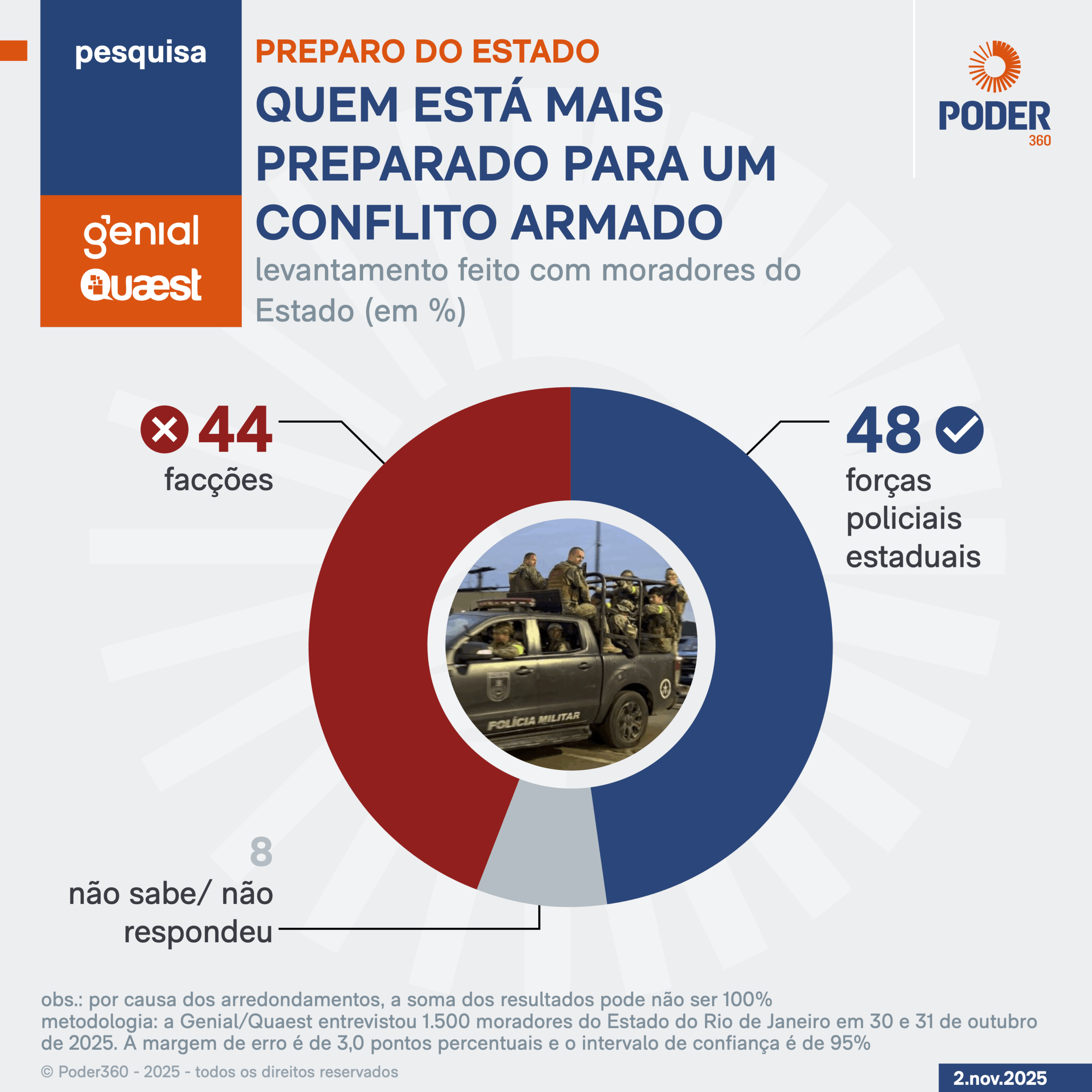 O levantamento também questionou quem está mais preparado para um conflito armado no Estado, as facções ou as forças policiais. Neste caso, há um empate técnico: 48% afirmam que são as polícias, contra 44% que dizem que é o crime organizado.