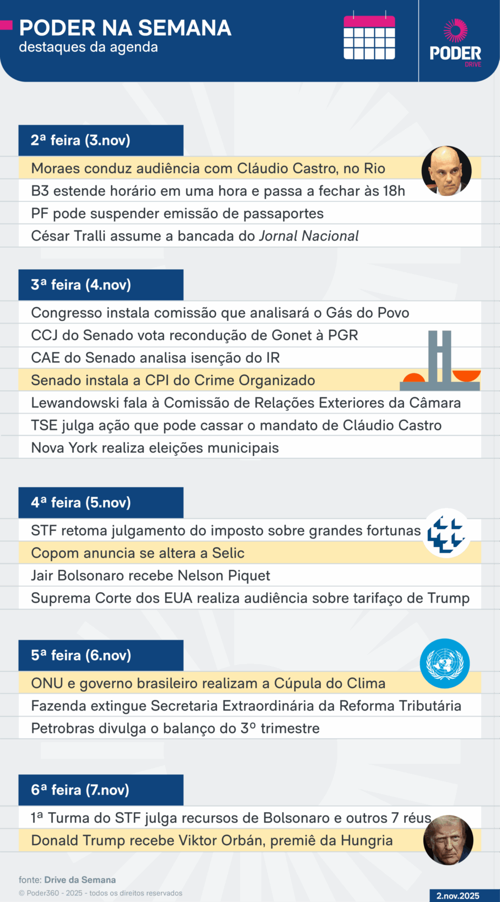 Na 4ª feira (5.nov), o STF retomará o julgamento sobre omissão do Congresso em não regulamentar o IGF (Imposto sobre Grandes Fortunas). O Copom (Comitê de Política Monetária) do BC (Banco Central) decidirá se altera a taxa básica de juros, a Selic. O ex-presidente Jair Bolsonaro (PL) receberá visita do ex-piloto de Fórmula 1 Nelson Piquet. E a Suprema Corte dos EUA realizará audiência sobre o tarifaço de Donald Trump (Partido Republicano).