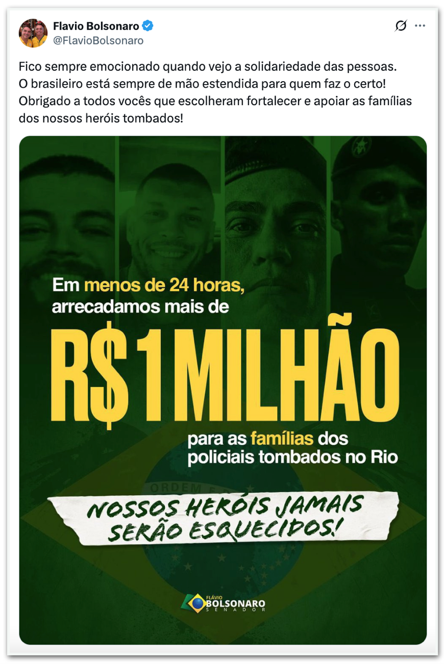 No domingo (2.nov), a vaquinha havia arrecadado R$ 531.466,50, superando, em 7 horas, a meta inicial de R$ 400 mil. Apesar de ter anunciado o encerramento naquele dia, o senador manteve a arrecadação no ar. Em seu perfil no X (ex-Twitter), passou a fazer uma contagem regressiva até atingir R$ 1 milhão e, ao alcançar o valor, agradeceu aos participantes. “Fico sempre emocionado quando vejo a solidariedade das pessoas. O brasileiro está sempre de mão estendida para quem faz o certo”, escreveu.