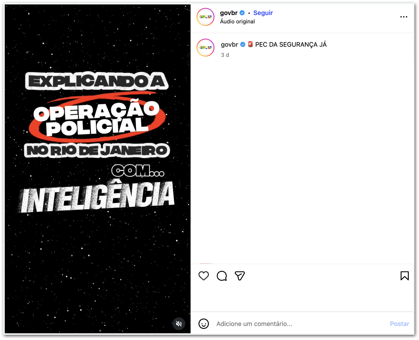 A 1ª postagem foi feita na 4ª feira (29.out), impulsionada no mesmo dia e também no sábado (1.nov.2025). É um reel (formato de vídeo curto do Instagram) explicando “com inteligência” a ação da polícia do Rio no dia anterior. O vídeo diz que esse tipo de operação coloca inocentes em risco e que “matar 120 pessoas não adianta nada no combate ao crime”. A postagem do governo diz que é preciso ter “mais inteligência e menos sangue”.