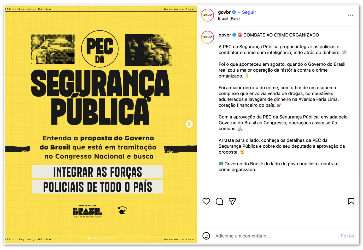 O 2º post impulsionado duas vezes no mesmo dia pelo governo foi postado na 5ª feira (30.out) no Facebook e no Instagram. Divulga a PEC da Segurança Pública, que busca integrar as forças policiais do país. Segundo a publicação, a proposta, se aprovada, fará as operações contra o crime organizado produzirem mais apreensões de armas com menor risco à população.
