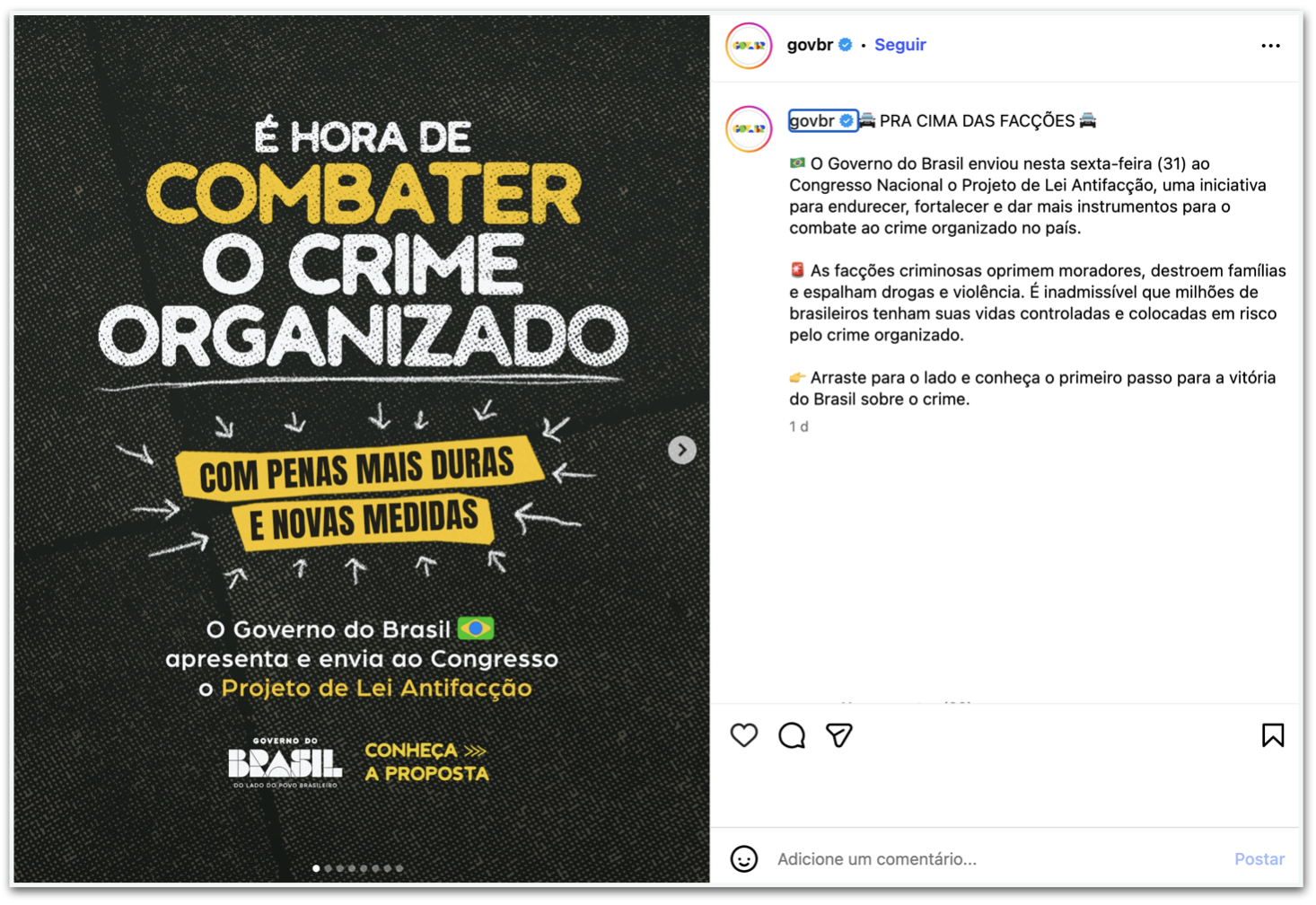 Outro post, divulgado e impulsionado na 6ª feira (31.out), é sobre o PL (projeto de lei) Antifacção, enviado pelo Executivo federal ao Congresso no mesmo dia. “As facções criminosas oprimem moradores, destroem famílias e espalham drogas e violência. É inadmissível que milhões de brasileiros tenham suas vidas controladas e colocadas em risco pelo crime organizado”, diz a postagem do governo.