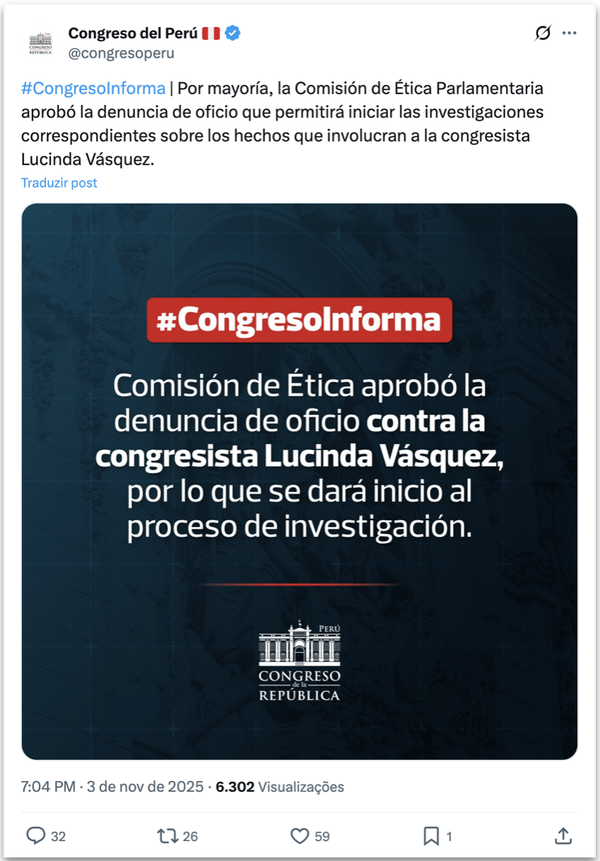 A comissão peruana divulgou a decisão em comunicado oficial. “Por maioria, a Comissão de Ética aprovou a denúncia de ofício que permitirá iniciar as investigações correspondentes sobre os fatos que envolvem a congressista Lucinda Vásquez“, informou a instituição em publicação no X.