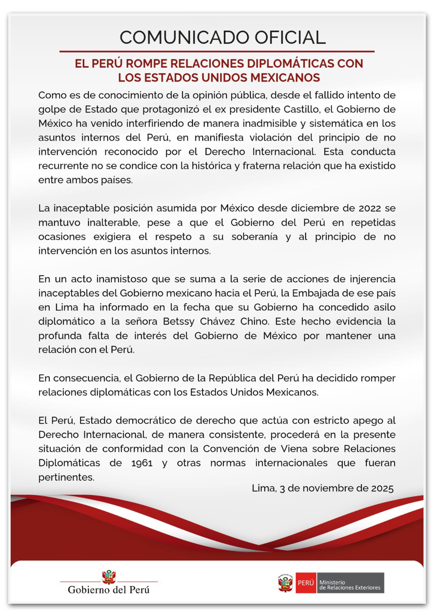 “Em um ato hostil que se soma à série de interferências inaceitáveis do governo mexicano em relação ao Peru, a Embaixada do México em Lima anunciou hoje que seu governo concedeu asilo diplomático à Sra. Betssy Chávez Chino. Essa ação demonstra o profundo desinteresse do governo mexicano em manter relações com o Peru. Portanto, o governo da República do Peru decidiu romper relações diplomáticas com os Estados Unidos Mexicanos”, lê-se na nota.
