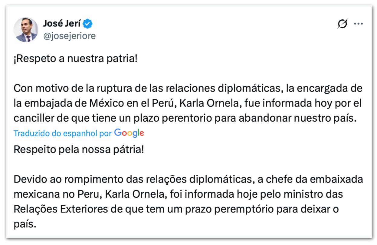 O atual presidente do Peru, José Jerí (Somos Peru, centro-direita), usou a rede social X para anunciar que a embaixadora mexicana no Peru, Karla Ornela, recebeu um prazo final para deixar o país.
