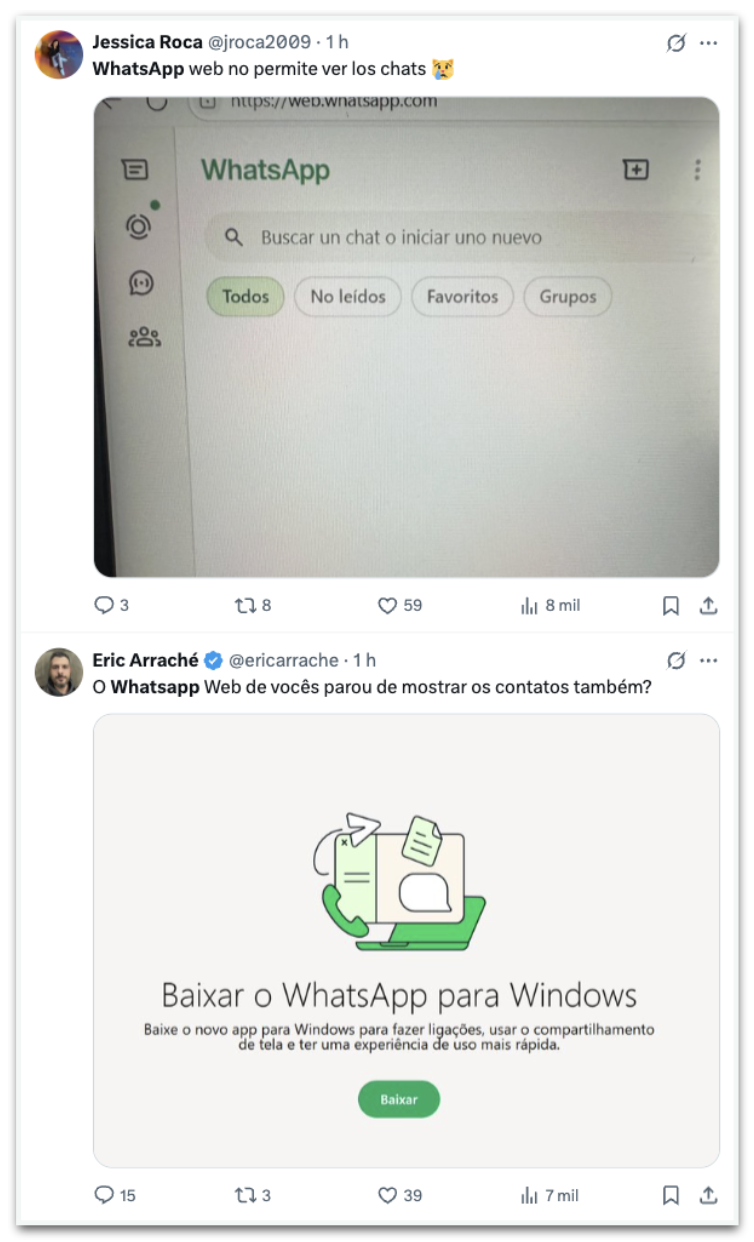 Nas redes sociais, usuários relataram problemas na conexão com a versão para desktop do aplicativo de mensagens. No X, postagens em português, inglês e espanhol falam sobre a dificuldade para acessar a plataforma, que apresenta erros em diversos países.