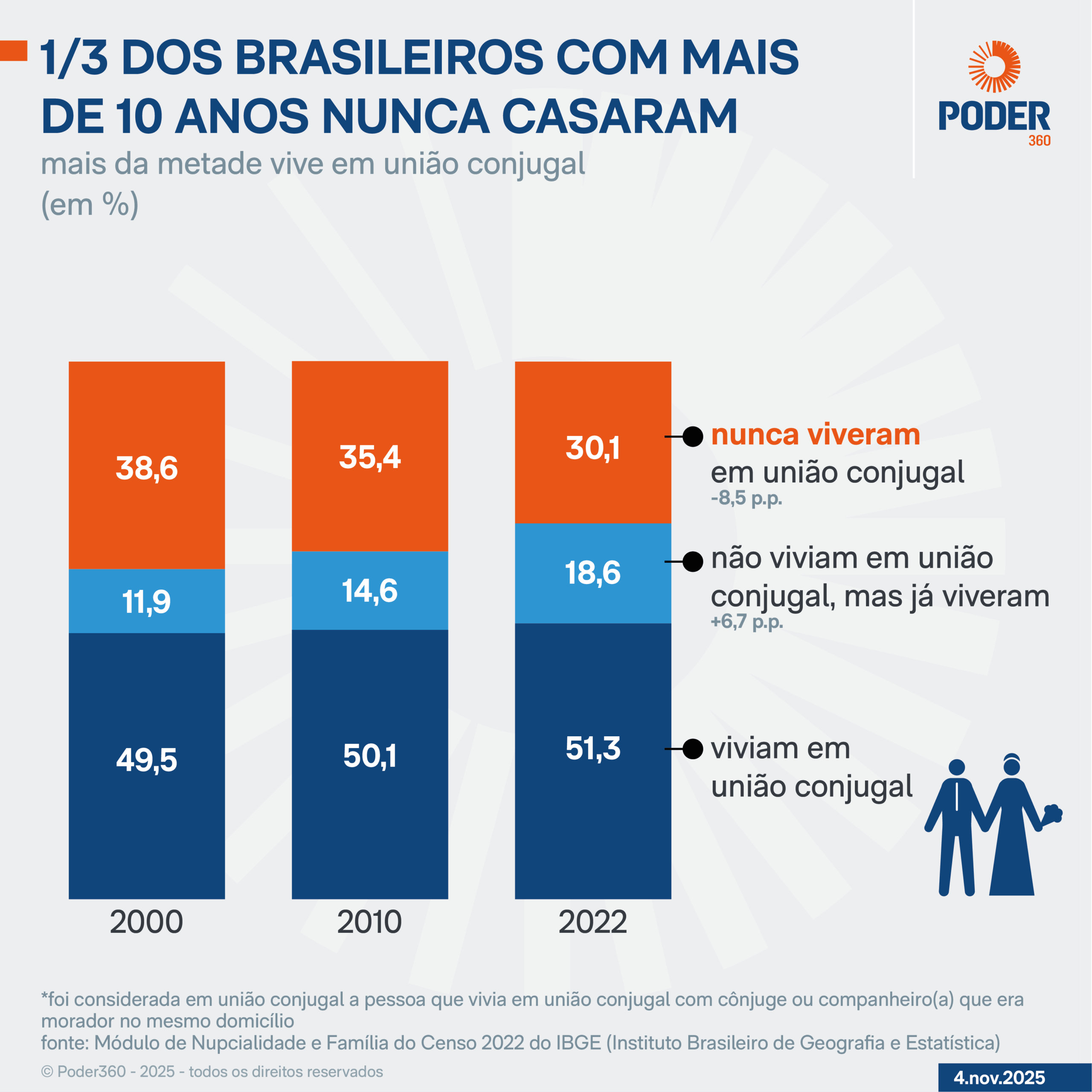 A parcela da população que vive em união conjugal praticamente não oscilou em 22 anos. Continuou representando praticamente metade dos brasileiros. Em 2000, correspondia a 49,5%. Em 2010, a 50,1%, e em 2022, a 51,3%.