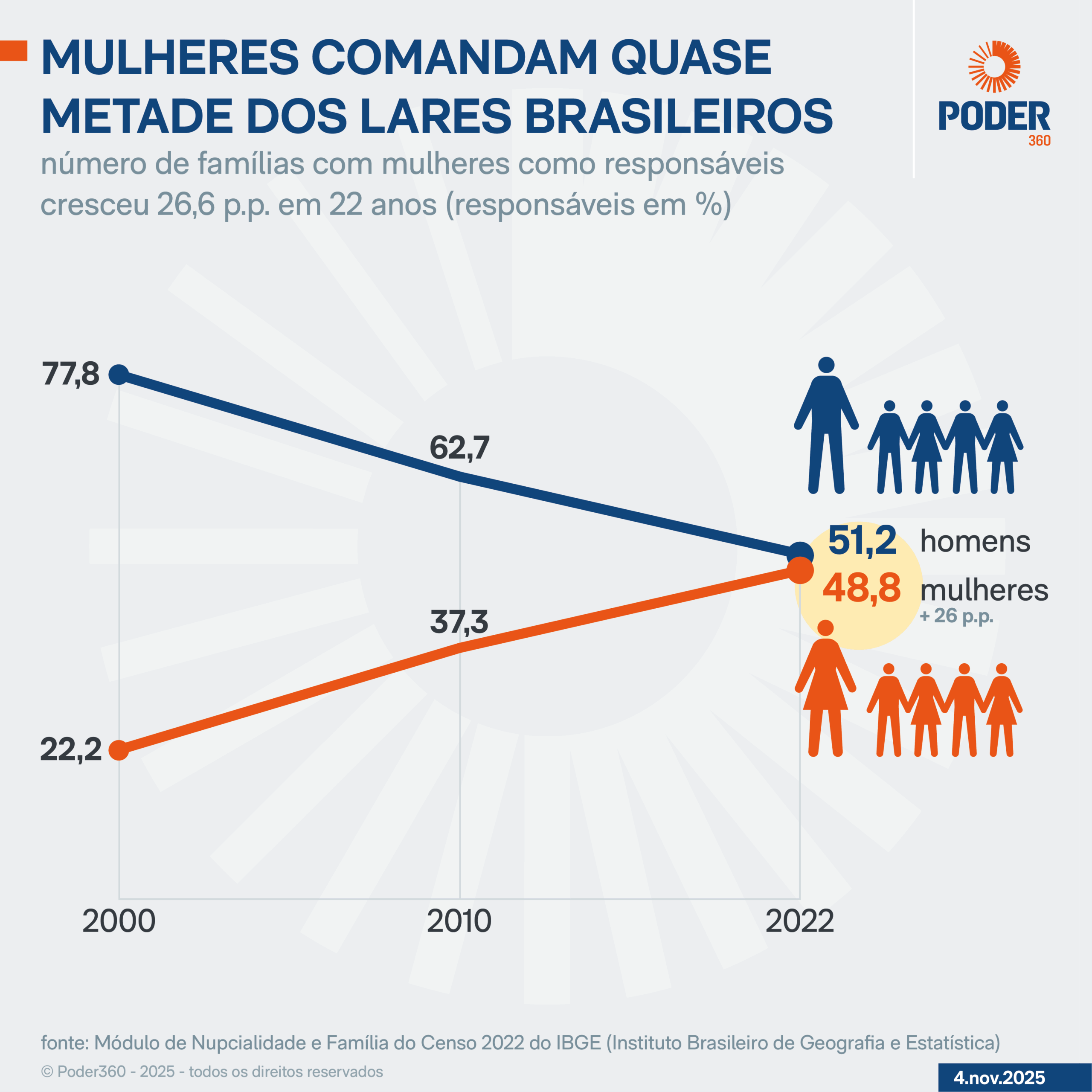 De 2000 para 2022, o percentual de famílias com responsáveis do sexo feminino cresceu de 22,2% para 48%, enquanto a proporção de lares comandados por homens caiu de 77,8% para 51,2%.