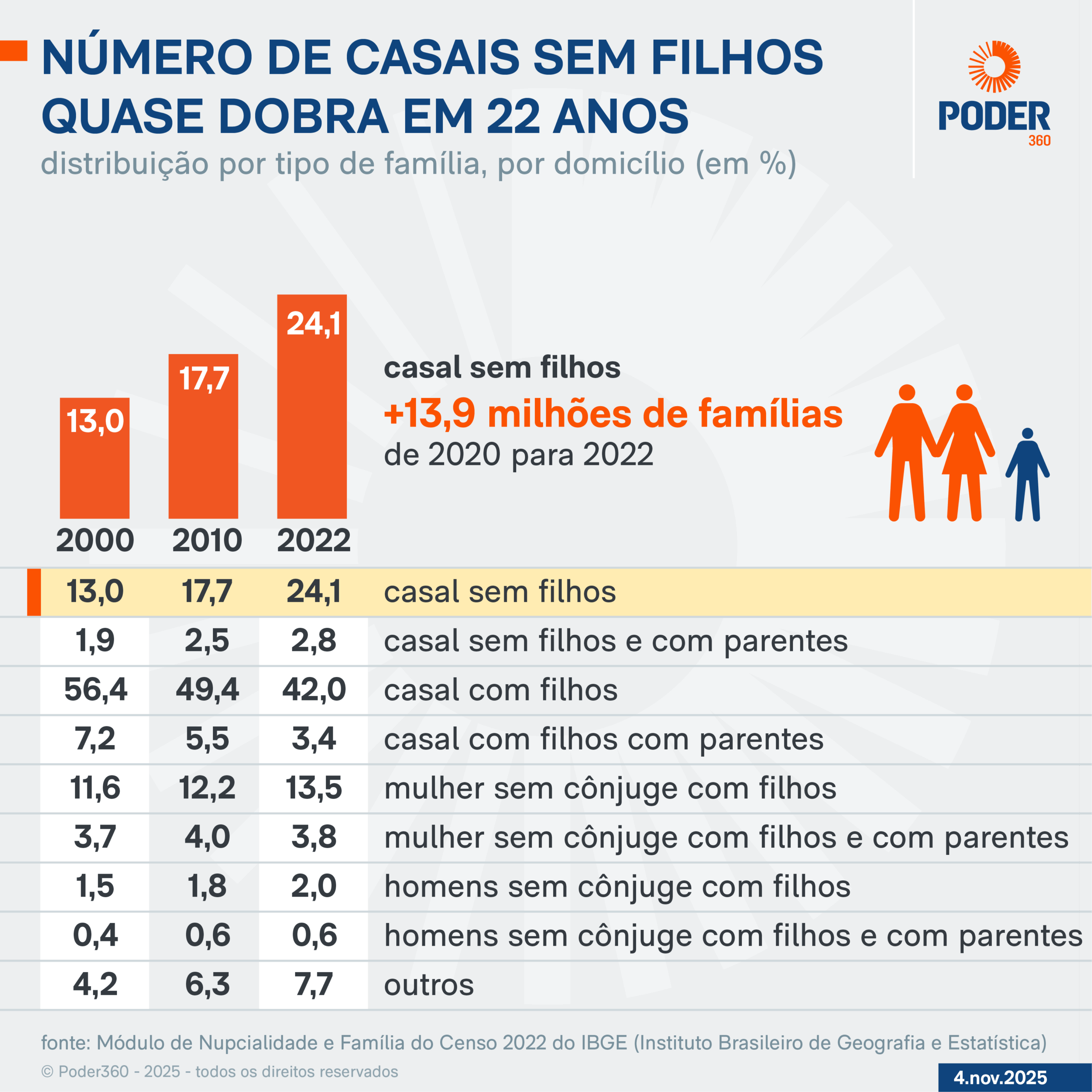 De 2000 para 2022, esse tipo de composição familiar passou de 13% para 24,1% dos domicílios brasileiros –quase ¼ das residências do país. A categoria foi a que mais cresceu no período. Em 22 anos, o salto foi de 13,9 milhões de famílias.
