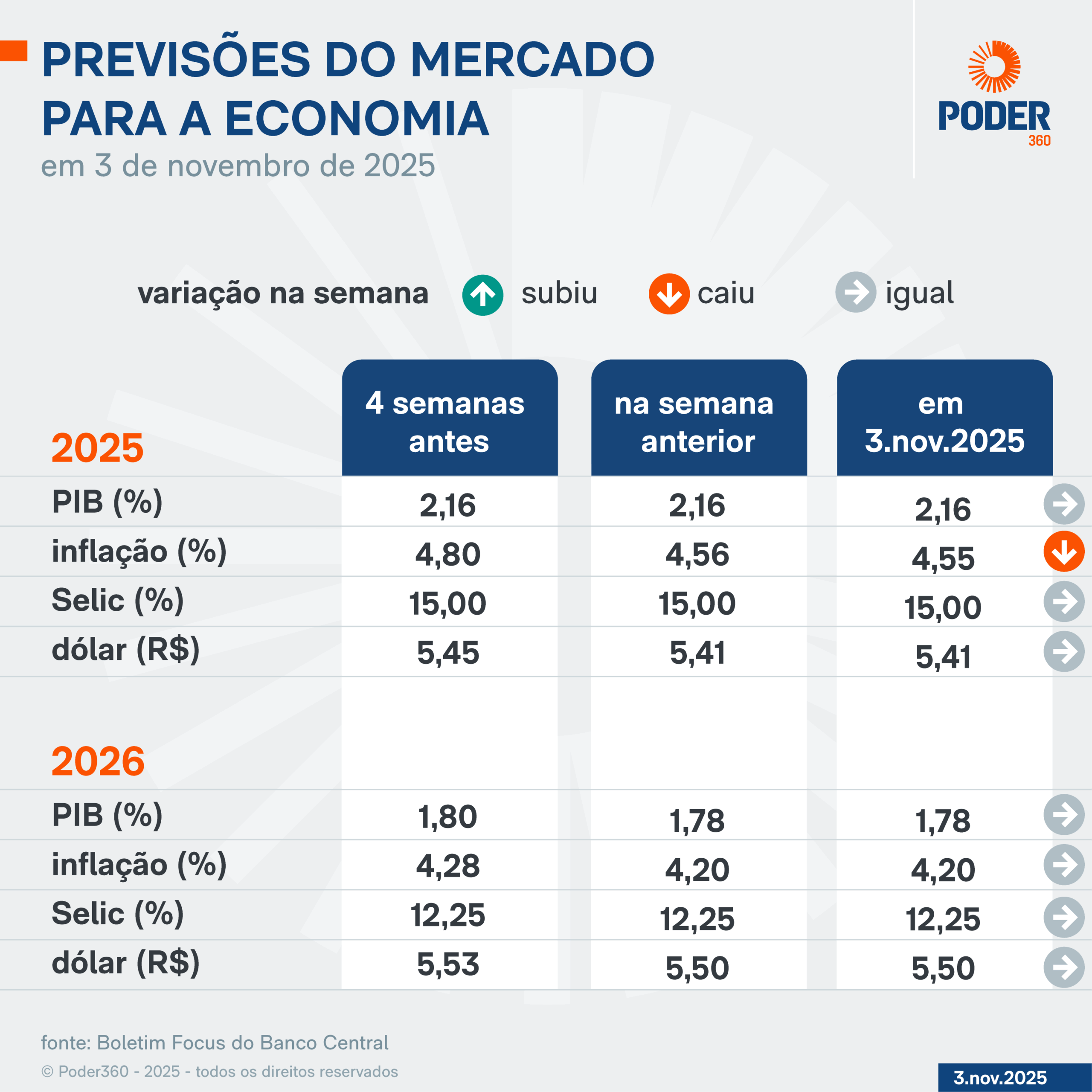 Em julho, o Banco Central anunciou que a inflação voltaria a ficar abaixo de 4,5% no 1º trimestre de 2026. O ministro da Fazenda, Fernando Haddad, disse acreditar que a taxa ficará dentro do patamar permitido já em dezembro deste ano.
