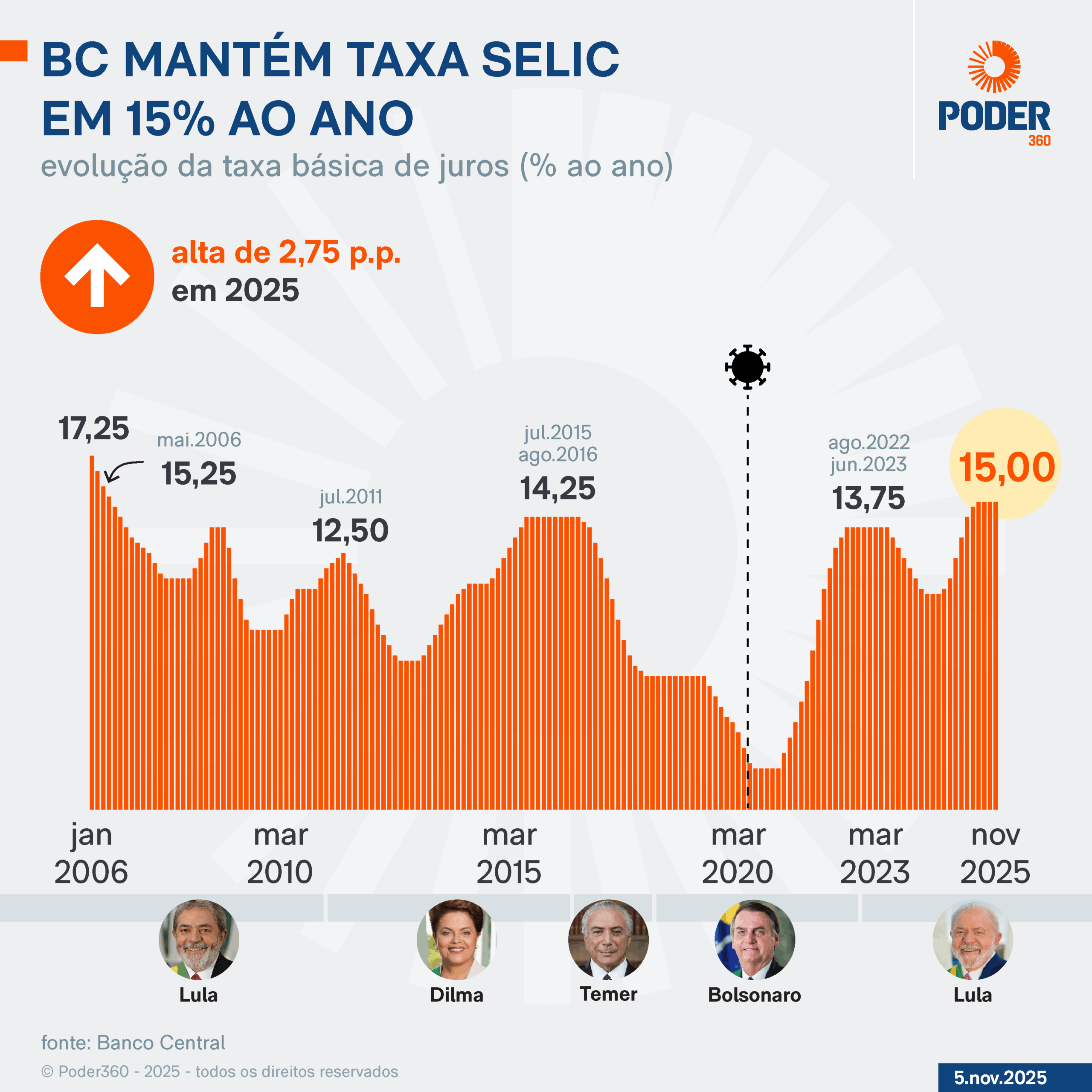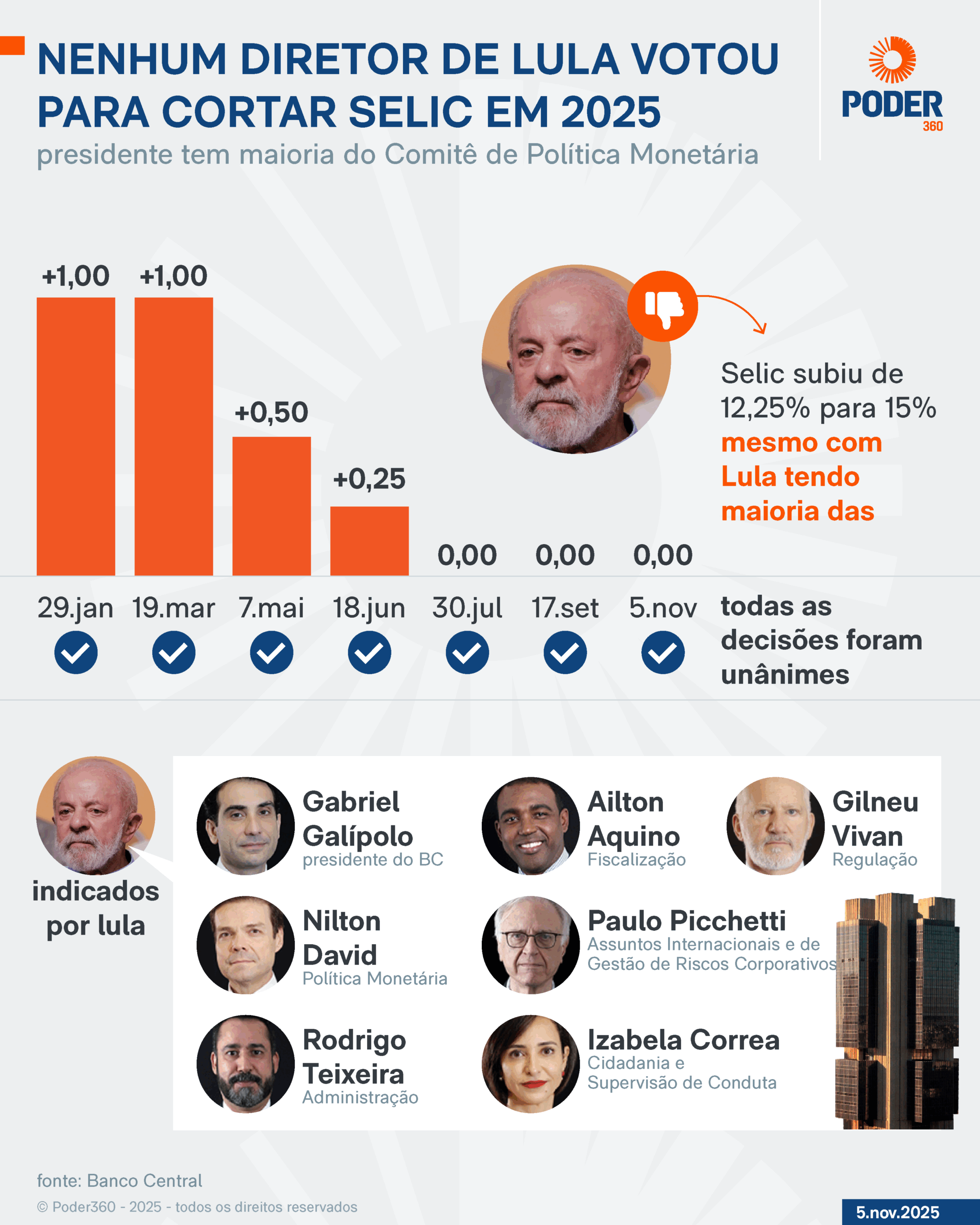 O governo Lula passou a ter maioria das cadeiras do Copom em janeiro de 2025. De lá para cá, foram 7 reuniões. Todos os diretores indicados pelo presidente optaram em votar por uma alta acumulada de 12,25% para 15% da Selic neste ano. Eles também decidiram manter o patamar de juros em 15% ao ano por 3 reuniões consecutivas.