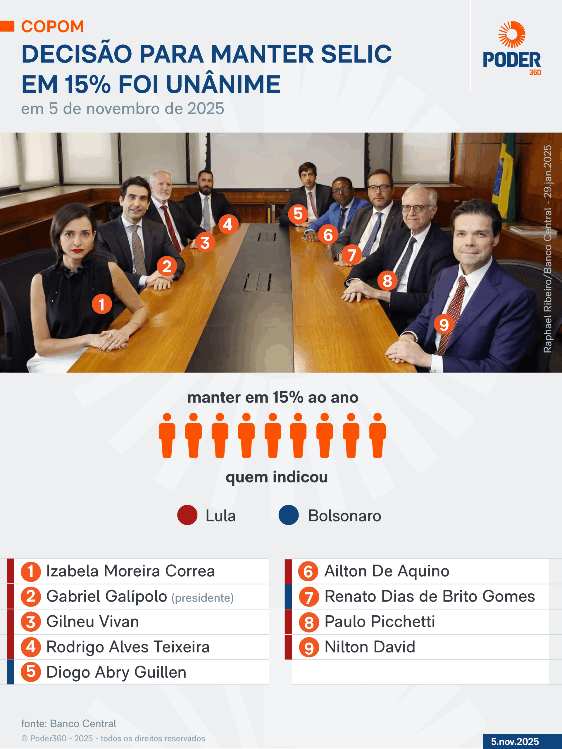 O colegiado é formado pelo presidente do BC (Banco Central), Gabriel Galípolo, e os 8 diretores da autoridade monetária. O presidente Luiz Inácio Lula da Silva (PT) indicou 7 das 9 cadeiras que ocupam o comitê. Nenhum dos nomeados pelo governo atual votou para cortar a Selic em 2025.