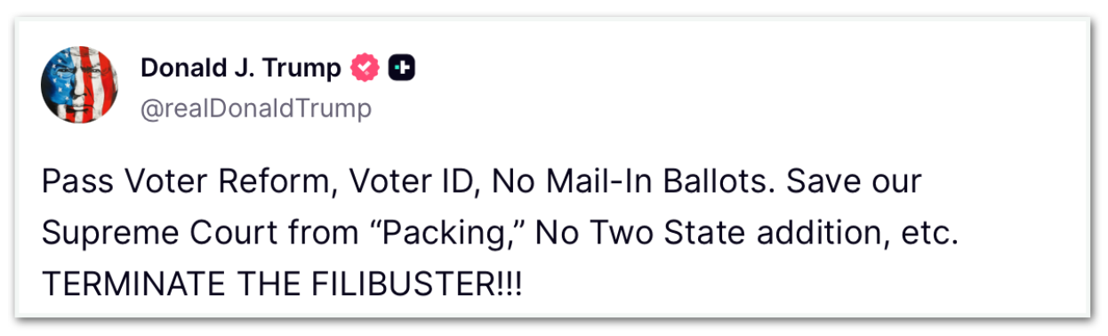 Trump defendeu mudanças no sistema eleitoral, incluindo o fim do voto por correspondência. Em outra publicação na rede social, declarou que “o Senado deve acabar com o filibuster”, regra que exige 60 votos para encerrar o debate e permitir a votação de projetos. Segundo ele, eliminar essa exigência permitiria ao governo aprovar propostas com maioria simples. O presidente não detalhou quais medidas seriam priorizadas se a mudança avançasse.