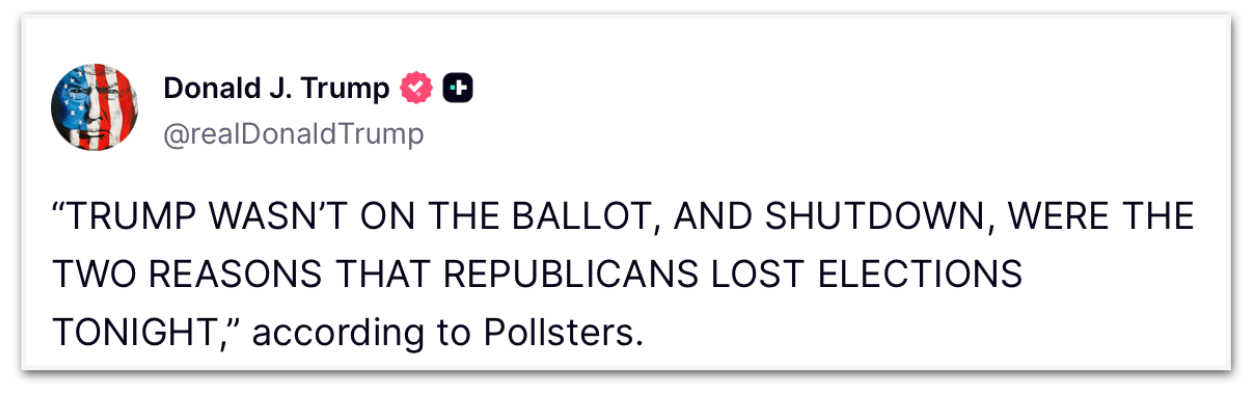 Em publicação na rede social Truth Social, o presidente escreveu: “Trump não estar na cédula e o congelamento do governo foram os 2 motivos pelos quais os republicanos perderam as eleições nesta noite”. Segundo ele, essa seria a avaliação “dita por institutos de pesquisa”, sem especificar quais.