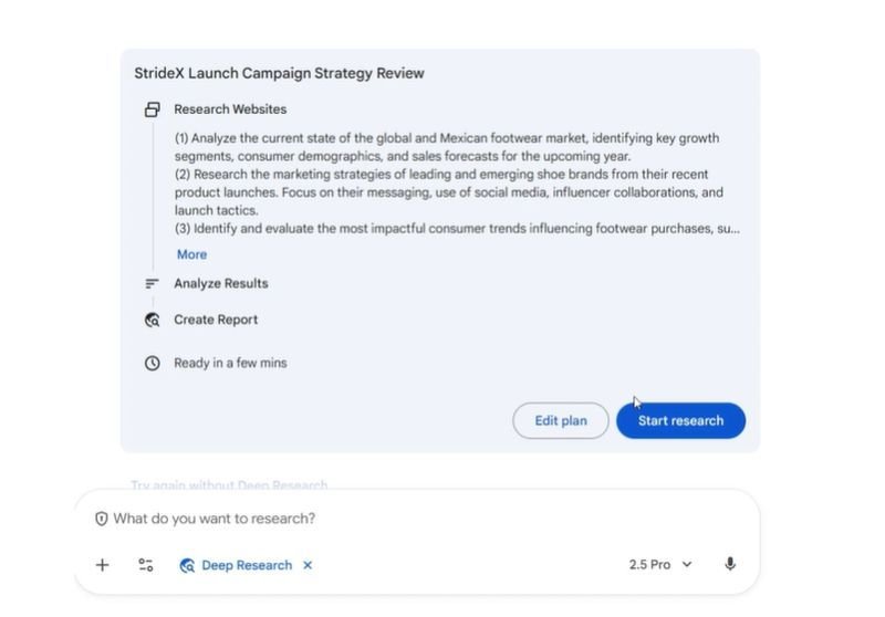 - Se você precisa de uma análise de mercado para um produto que será lançado, por exemplo, pode pedir ao Deep Research para ler os documentos de brainstorming da sua equipe armazenados no Drive;