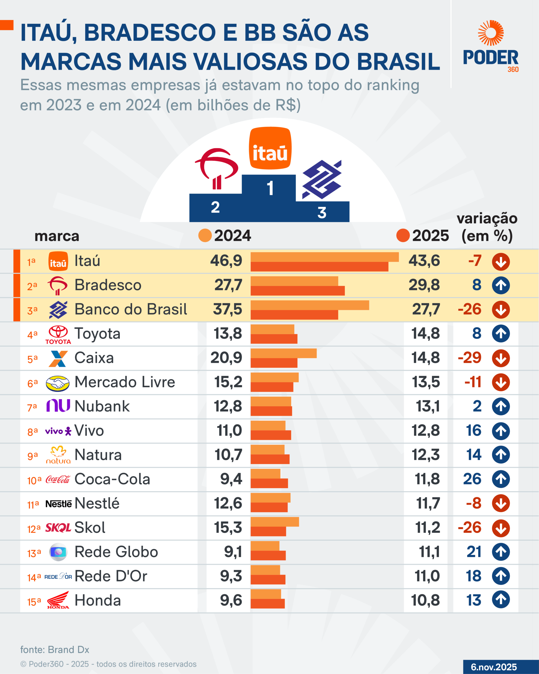 Mesmo ocupando o 1º lugar do ranking tanto em 2024 quanto em 2025, o Itaú teve queda de 7% de seu valor no período, passando de R$ 46,9 bilhões para R$ 43,6 bilhões.